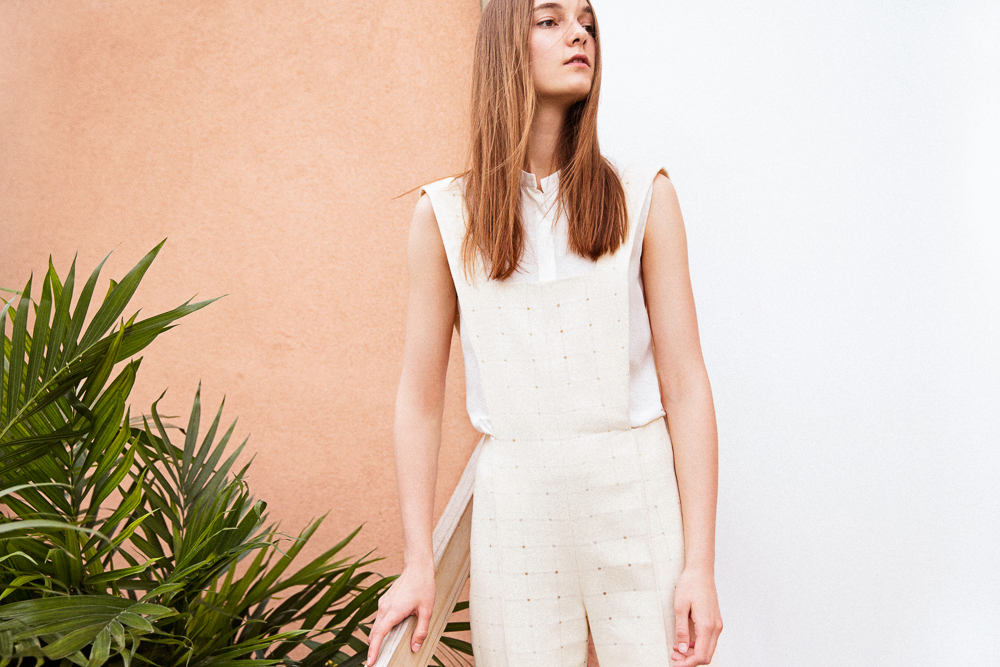 For the time being, she's got plenty to work with—when in the office, she had a bag full of costume changes. There were multiple pairs of Prada sunglasses, a few lacy bras, a Wang dress that wasn't necessarily day-time appropriate...Eventually, she tried on a pair of light, gridded À MOI overalls, making a surprisingly strong case for the mandarin collar. Also making a good case to give up your skinny black jeans and gray tank top. Come on guys, it's summer.