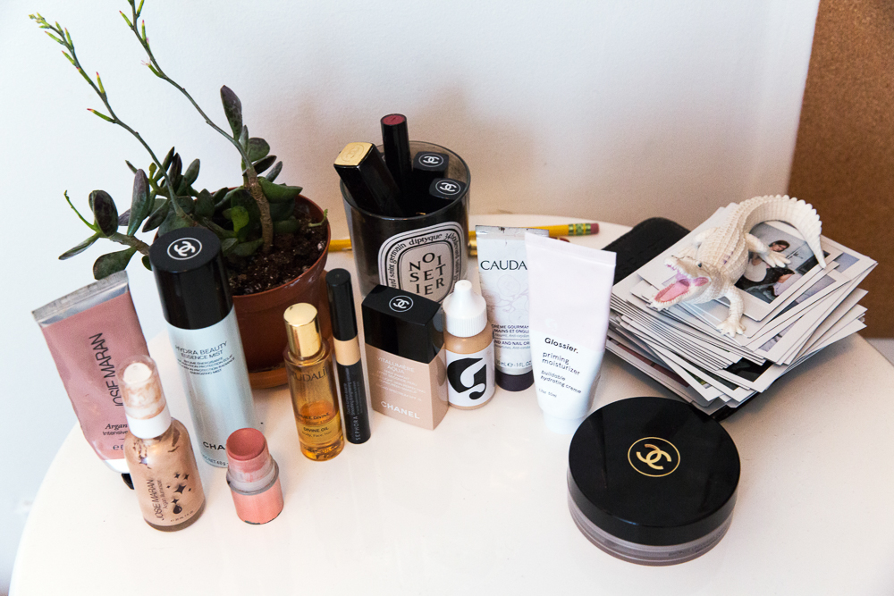 I really love Josie Maran’s line so I use her Argan Cream Blush in Sunkissed. Her stuff is really great—I also really love her Argan Infinity Cream Intensive Creamy Oil because my skin is dry. Then I like to mix some of the Josie Maran Argan Enlightenment Illuminizer with a drop of the Glossier's Priming Moisturizer and a drop of the Perfecting Skin Tint in Mediu m and a drop of my Chanel Vitalumière Aqua Ultra-Light Skin Perfecting Sunscreen Makeup Broad Spectrum SPF 15. I want my skin to look as natural as possible, but I still want to be covered up. The Chanel Soleil Tan de Chanel Bronzing Makeup Base is great sometimes, too. It’s super light, so you can blend it and make it look realistic. I have an olive skin tone, so I can get darker with my makeup.