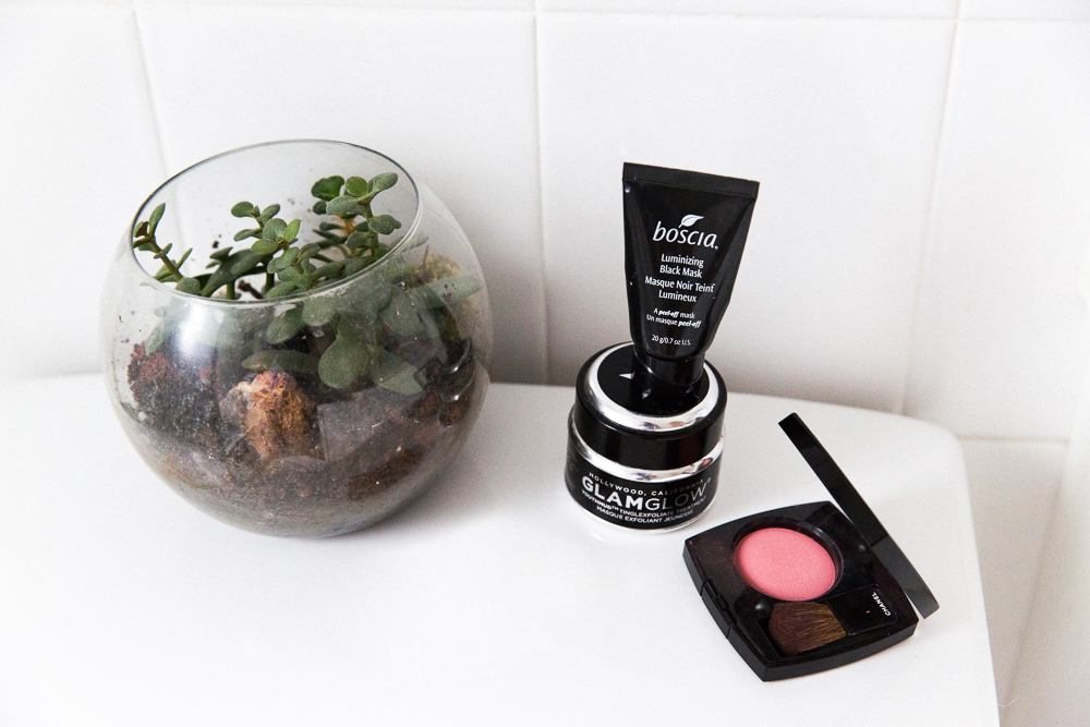 A lot of times I accidentally sleep with my makeup on. That happens more than it should, and Glamglow's Youthmud Tinglexfoliate Treatment is great for that. You can kind of apply it as light or as thick as you want, and it’s quick. I like the Boscia Luminizing Black Mask, too, but it takes a little longer.