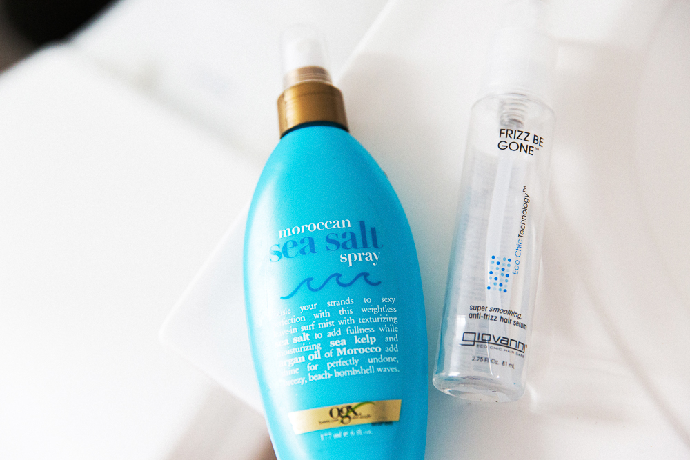 My hair is crazy curly and thick, and it drives me crazy. During the winter, I straighten it, but in the summer I just stop. It gets curlier than this, but I’ll braid it when it’s kind of damp, or I’ll put stuff in it—mostly Giovanni's Frizz Be Gone Serum and OGX's Moroccan Sea Salt Spray. Now, I like to wear it kind of wavy and down. I feel like the weather, especially in New York, has a lot to do with your look when you're going out.