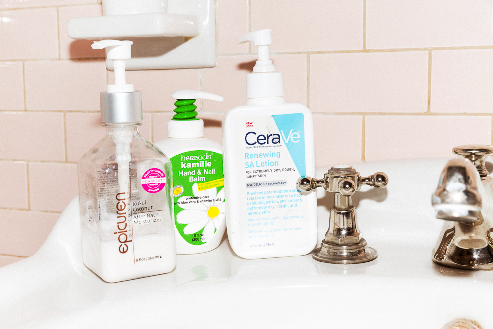 Since I was a kid, I've gotten in the habit of putting on lotion head-to-toe—lotion, lotion, lotion...plus lip stuff. I use Lubriderm Daily Moisture Lotion because it’s big and hospitals use it. Now that it's summer, I like using Skin Trip's Mountain Ocean Coconut Moisturizer or Epicuren's Kukui Coconut After Bath Moisturizer. I’m always changing my body lotion. And then there's hand cream—I go through a lot of that. This Santa Maria Novella Crema Per Le Mani is my favorite, but I also have Herbacin's Kamille Hand and Nail Balm because it's got glycerin in it. I don’t know why glycerin is so good, but I like the thickness of that, and I blame it on the glycerin.