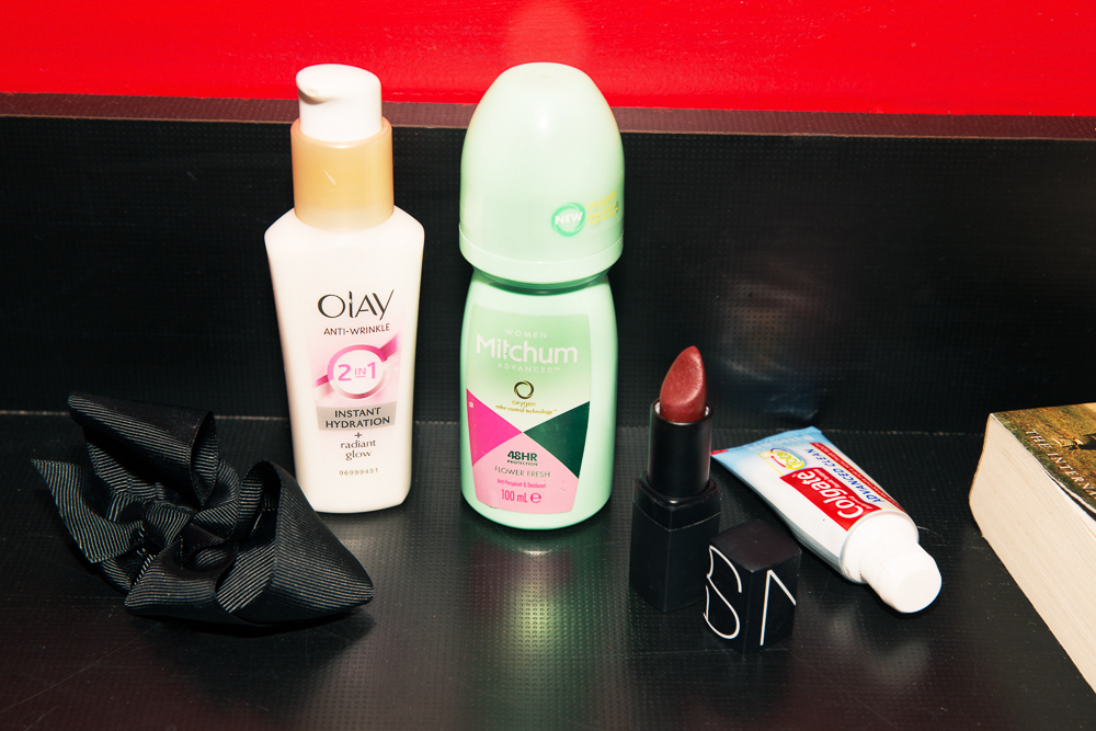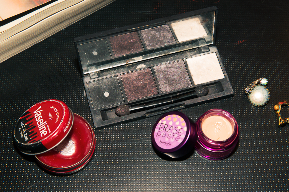 At that point, I decided I only needed the necessities. I just bought a concealer, Erase Paste by Benefit. I bought a mascara from Benefit as well, Roller Lash. Both products aren't really heavy, which I like. The Erase Paste is good because I don’t like being caked in makeup. But then when I have bags under my eyes, I put it on and it’s just natural. Roller Lash isn’t clumpy at all. It's elongating rather than thickening. Then I have Nars Semi Matte Lipstick in Fire Down Below, which sounds weird. I like red lipstick, but I feel like dark red is more like an extreme tint if you know what I mean. I also have Benefit's Benetint because it's easier to get a stained look with, and it's better for performing because you can’t wear heavy lipstick on stage or the mic will smudge it. Then I’m thinking about my lipstick instead of performing. Same goes for fake eyelashes. I can’t wear them on stage because I don’t want to be thinking about it. Instead, I like the Topshop Smokey Eyes Quad in Smouldering. I just use the black on the side. It's like a liquid eyeliner for a good cat eye but done with a shadow. I try to do graphic, and then I smudge it up.