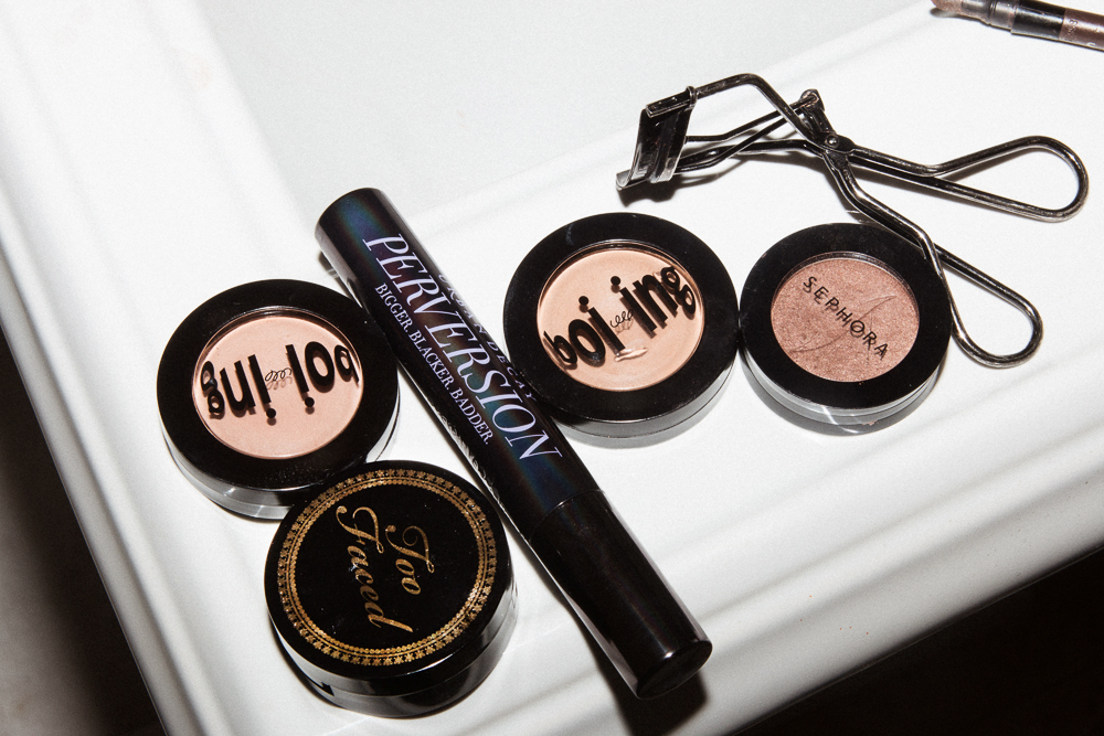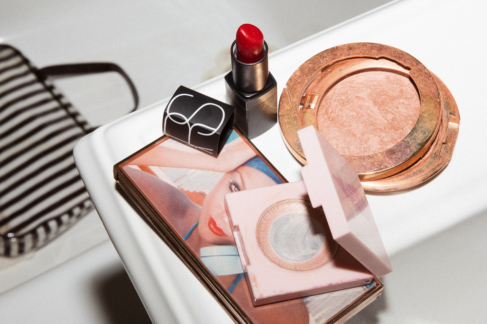 I only wear foundation when my skin is breaking out—and then it's Estée Lauder Double Wear Stay-In-Place Foundation. My skin used to be perfect because I didn't do anything to it. I only washed it with water! The pollution in New York also makes me break out like crazy. My favorite concealer is Benefit's Boi-ing Concealer. I just have to mix it because my color changes all the time. I just like how it’s not too shiny, but it’s not heavy. The only eyelash curler that works is Shiseido's Eyelash Curler. It’s the only one that fits my eye. Then I use mascara. I go through phases. Now I'm using Urban Decay's Perversion Mascara to lengthen and give volume to my lashes. My favorite eyeshadow to use at night is Sephora Collection's Colorful Eyeshadow in No. 78 Lucky Penny. I can’t find any other one just as good. I love the color—it’s a little golden, a little reddish. It’s very subtle, but it shows up in the right places. When I know what I like, I’ll use it forever. Then I’ll use Too Faced's Bulletproof Brows to fill in my brows. I have a bad habit of pulling at my eyebrows when I’m stressed. I have gaps on the ends, so I need to fill them in. For blush, I’ll use this completely destroyed one from Victoria’s Secret—go figure. It's their Baked Mineral Bronzing Powder, which, by the name, you can tell it's actually a bronzer—I just use it as blush. I love it. Then I’ll put on a highlighter— Luma's Illuminating Highlighter is my favorite. I put it on my cheeks, the bridge of my nose, eyes, and Cupid's bow. And for my lips, I usually always carry around Nars' Velvet Matte Lip Pencil in Mysterious Red because it’s very easy to use and reapply. But today, I want to go with this Nars Hardwired Lipstick in Deadly Catch. They used it on me for a shoot the other day and let me keep the lipstick. I love the color.