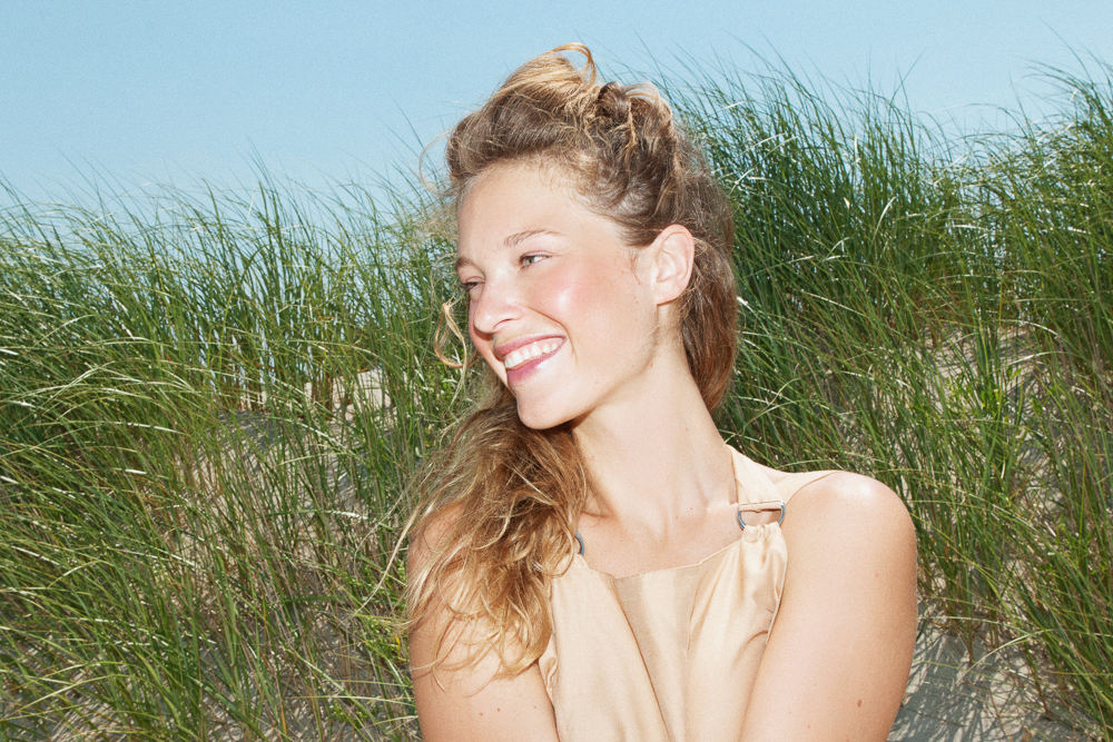 I'm sure a lot of you know this already—natural blushing feels good and looks beautiful. Recreating it is actually fairly easy and surprisingly effective in offering a brand new version of pretty when all else feels lackluster. The color for summer is tawny and peach, sitting high on your cheekbones—and it is perfectly demonstrated on our model, Heloise, who Tom and I took to the Rockaways to shoot wearing a few super-malleable cream and liquid cheek tints.