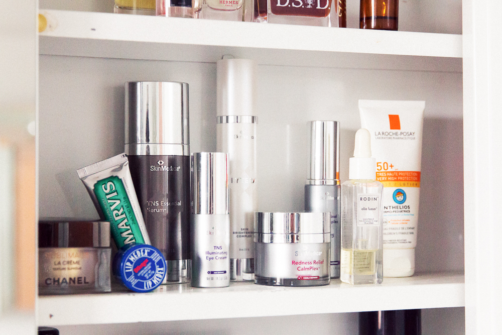 For my face, I've used Cetaphil since forever. I love a heavy cream along with that though. I use one from Chanel Ultra Correction Lifting Firming Day Cream and Line Repair Night Cream. I’m really into Skin Medica right now. The TNS Essential Serum, that’s the main thing. Like everyone else, I'm obsessed with Rodin Olio Lusso Luxury Face Oil.
