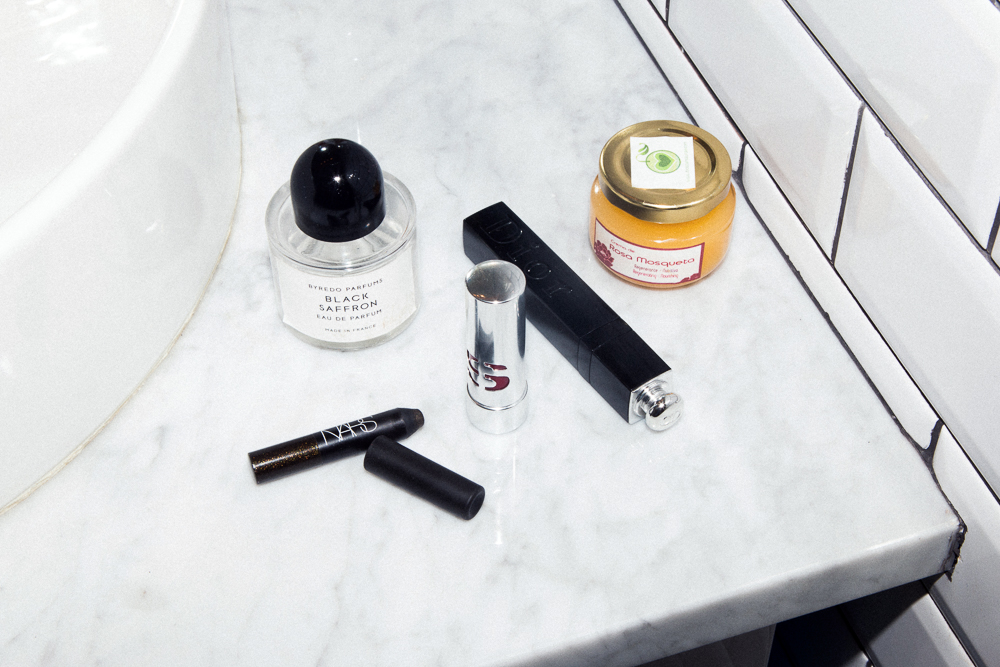 When I come home I remove my makeup with coconut oil, always. I try to wash my face with cold water because it’s apparently very good for your pores, and it also wakes you up. Sometimes I’ll use the light Hydrating Facial Moisturizer from Forest Essentials, an Ayurvedic Indian company. It smells amazing! The texture is a little bit watery—when you put it on, your face absorbs it but is a little bit moist…it’s perfect. Whenever anyone I know goes to India, I ask them to get me Forest Essentials.