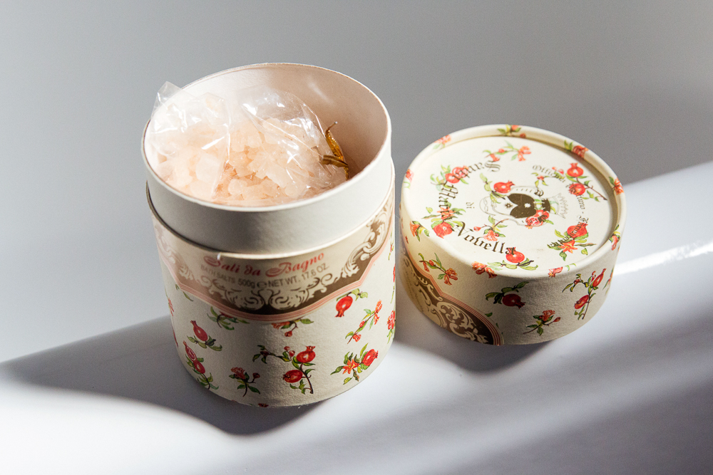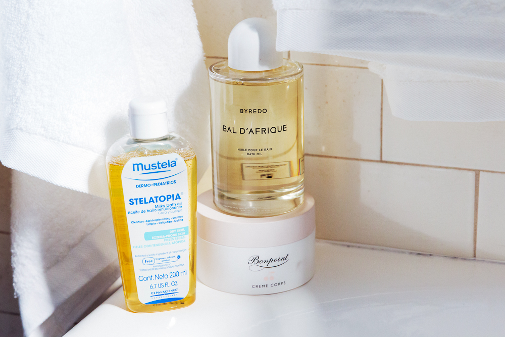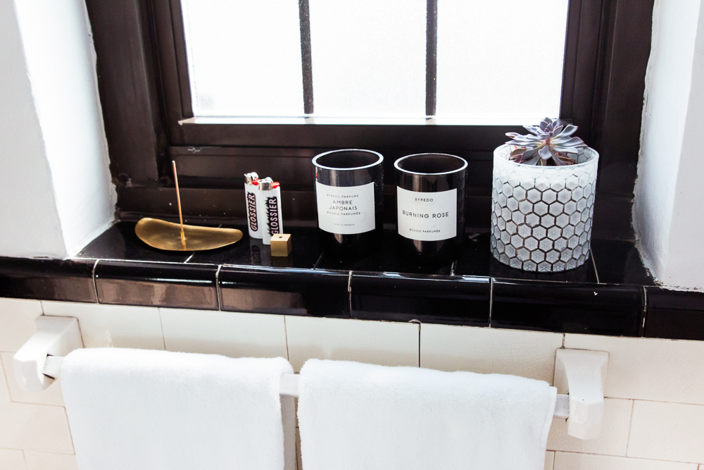 My fiancé and I just moved into an apartment that was built in the 1930s, which is great because it means the bathroom is really big and has a separate tub. Just about every night, I take a 20 minute bath to unwind. I'll use like half a bag of epsom salt and add a few drops of ylang ylang oil just because it smells really nice. My tub has a nice nook for a candle, and my favorite one right now is Burning Rose by Byredo. It's actually the same one we burned all summer in the Glossier Summer Fridays Showroom. Their packaging is just insane—I also have the Bal D'Afrique Bath Oil. It could not be more beautiful so I always keep it out. It moisturizes and also subtly foams.