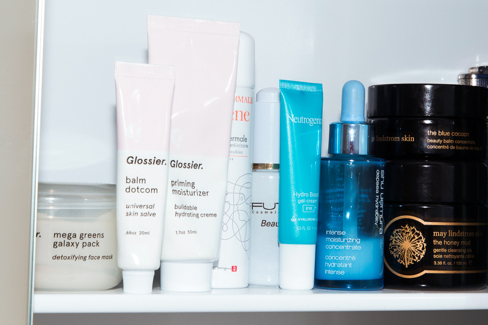 My skin's pretty basic—it's not particularly oily, it's not particularly dry, and I'm not acne prone. When I was in my 20s, I was getting hormonal acne under my chin, which wasn't a good look. But other than that, I'm just sensitive. When I get out of the shower, I'm pretty red. That's why, especially with the Glossier products, I figure why not just use stuff made for sensitive skin? We've been testing cleansers—we actually have the final formula of it now, thanks to a lot of input from our readers and our chemist—so I use that to wash my face. I pat it dry and apply the Priming Moisturizer—sometimes I add in a serum. Shu Uemura Deep Sea Hydrability Intense Moisturizing Concentrate feels like it's giving me extra moisture when I put it on damp skin. Or sometimes I use Beauty Drops #3 from Future Cosmetics Boutique, which is an Israeli cosmetics brand. That one's a little more like a dry face oil. And I've also been using an undereye cream just for extra moisture—I'm not looking to get rid of dark circles or de-puff or anything like that. Neutrogena's Hydro Boost Gel-Cream Eye is one that I've been carrying around. When it's super cold out, I like Crème MSR-H from Biologique Recherche. I really like the smell—it's a bit like Palmer's Cocoa Butter—and I heard the Olsen twins use it.