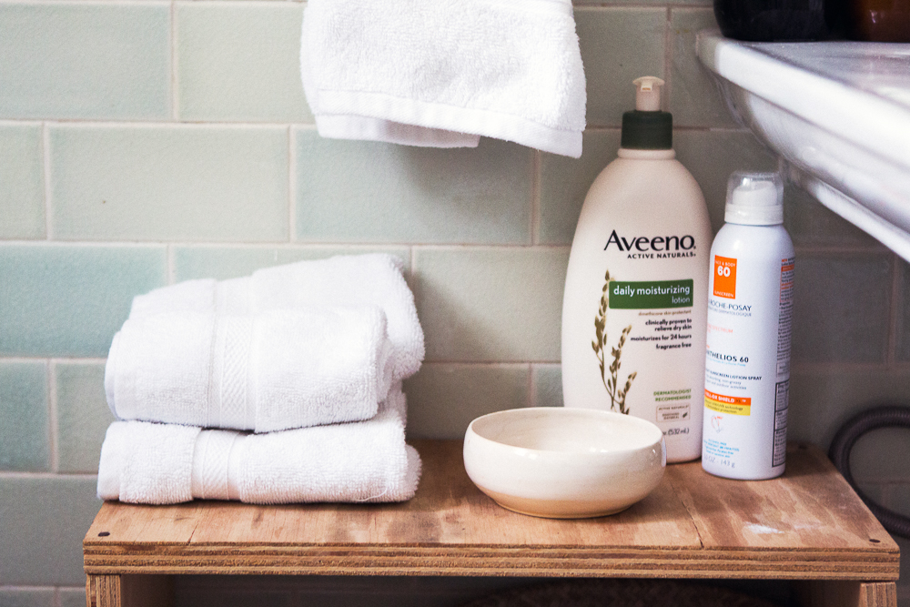 I have the Glossier Mega Greens Galaxy Pack, which is strong, but I use it. And I really love the Glossier Soothing Face Mist. I work from home, so I sometimes just come in the bathroom and do a spritz. I have the Fenix Daily Rehydrating Sunscreen, which my facialist gave me. I like it because it’s a moisturizer and a sunscreen. It’s one step, which I’m into. And that’s it. I keep my bottles open with the caps off, because closing it is just an extra step. I told you I was lazy!