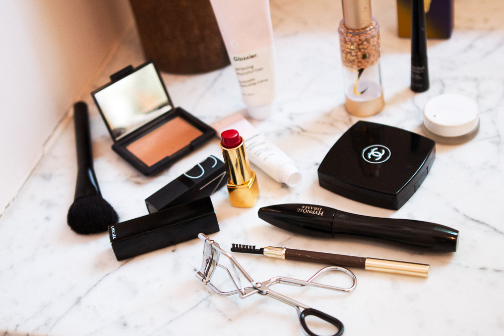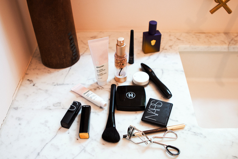 I use Jane Iredale Liquid Minerals Foundation. I’ve been using it forever. It’s really light and so it’s the only thing that doesn’t fuck up my skin. I use Nars Zen blush as a bronzer on my face and RMS Beauty “Un'cover-Up in 11. Then, I pencil in my eyebrows with this Clarins pencil. And I use Hypnôse Drama Instant Full Body Mascara by Lancôme. I like it because it’s super black and sort of thick. I’ll do a little bit of Revlon ColorStay Liquid Liner. Just a little flick on the end of my eye. And I always curl my lashes everyday with my curler that I got from Dermstore. For lips, I like the Glossier Balm Dotcom because it’s thick and it works. I use Chanel Rouge Allure Lipstick in Pirate. I like Nars Heatwave too. They’re my go-to reds.