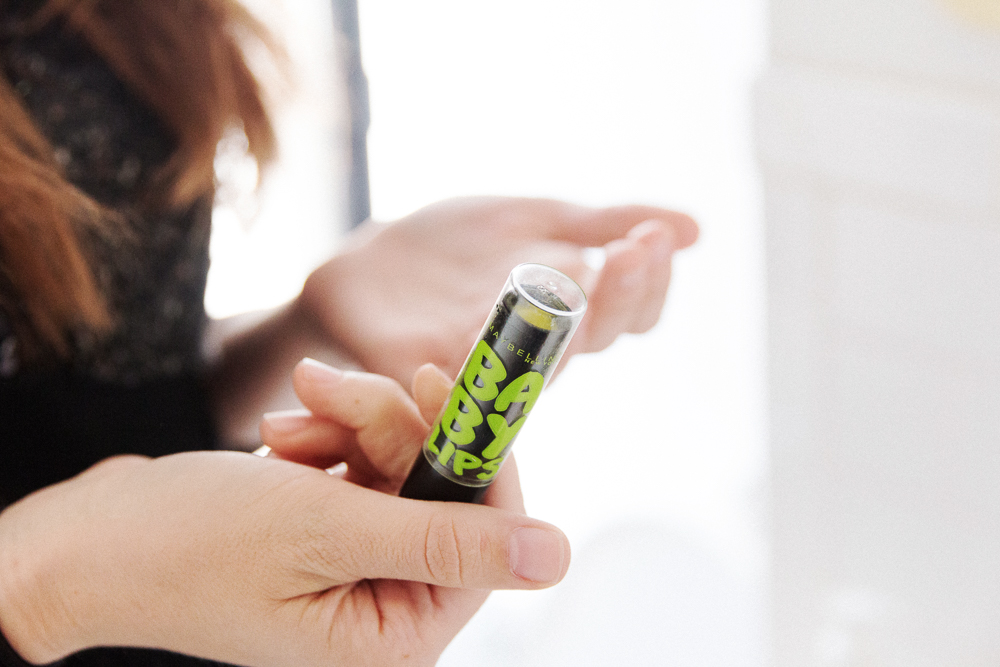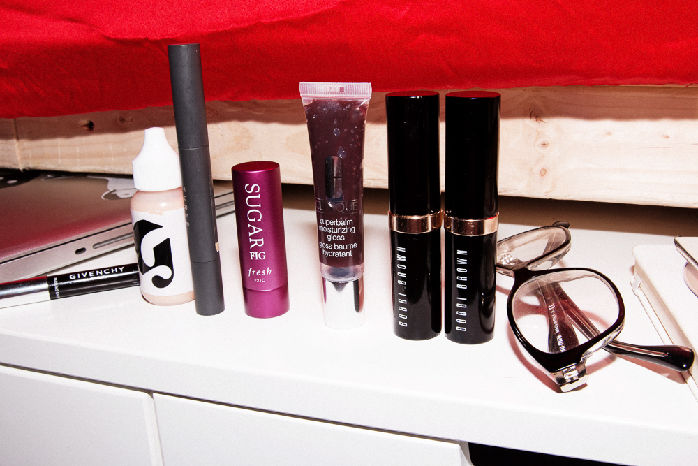I also have one of the tinted Fresh Sugar Lip Treatments. It’s the plum one, so it’s kind of deep in color, and I’ll put that on my lips or on my cheeks. But I also have a Clinique Superbalm Moisturizing Gloss. It’s new, and I really like it, so I’ll put that on my lips sometimes, too. It doesn’t feel sticky or lip gloss-y, which I can’t stand. I used to be so obsessed with lip balm—and I still am, but I used to have a bag full of every single lip balm that had ever existed and it got really out of control, so I try to just stick to a couple of things. But I definitely like them to feel moisturizing. And then—Oh, I love Maybelline Baby Lips. Grape Vine is the goth Baby Lips, but still completely see-through when you put it on.