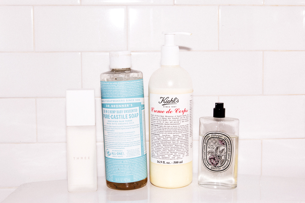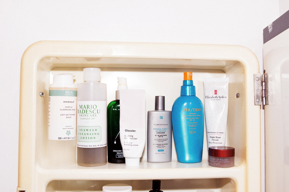 In the morning, I wash my face with Ren Evercalm Cleansing Milk and at night I use Mario Badescu Seaweed Cleansing Lotion. I'll just put it on a cotton pad and wipe my face with it—it's so frightening what comes off of your skin at the end of the day when you live in New York. I'll also use some Dr. Alkaitis products, which I found at Great Jones Spa. I've been using their Organic Nourishing Treatment Oil for a long time, but I don't really know how it works. Then I use the Glossier Priming Moisturizer, which I really like especially for summer because it's light. No eye cream or anything else. Maybe that'll change, but for now I feel like I don't need to overthink the routine or have it be decadent. But I do use SkinCeuticals SPF 50 Physical Fusion UV Defense Sunscreen every day. Over the past few years, I've noticed I've gotten really sensitive in the sun. I'm very fair so I always wear sunscreen and long sleeves even in August, which is horrible. I use Shiseido Sunscreen on my body.