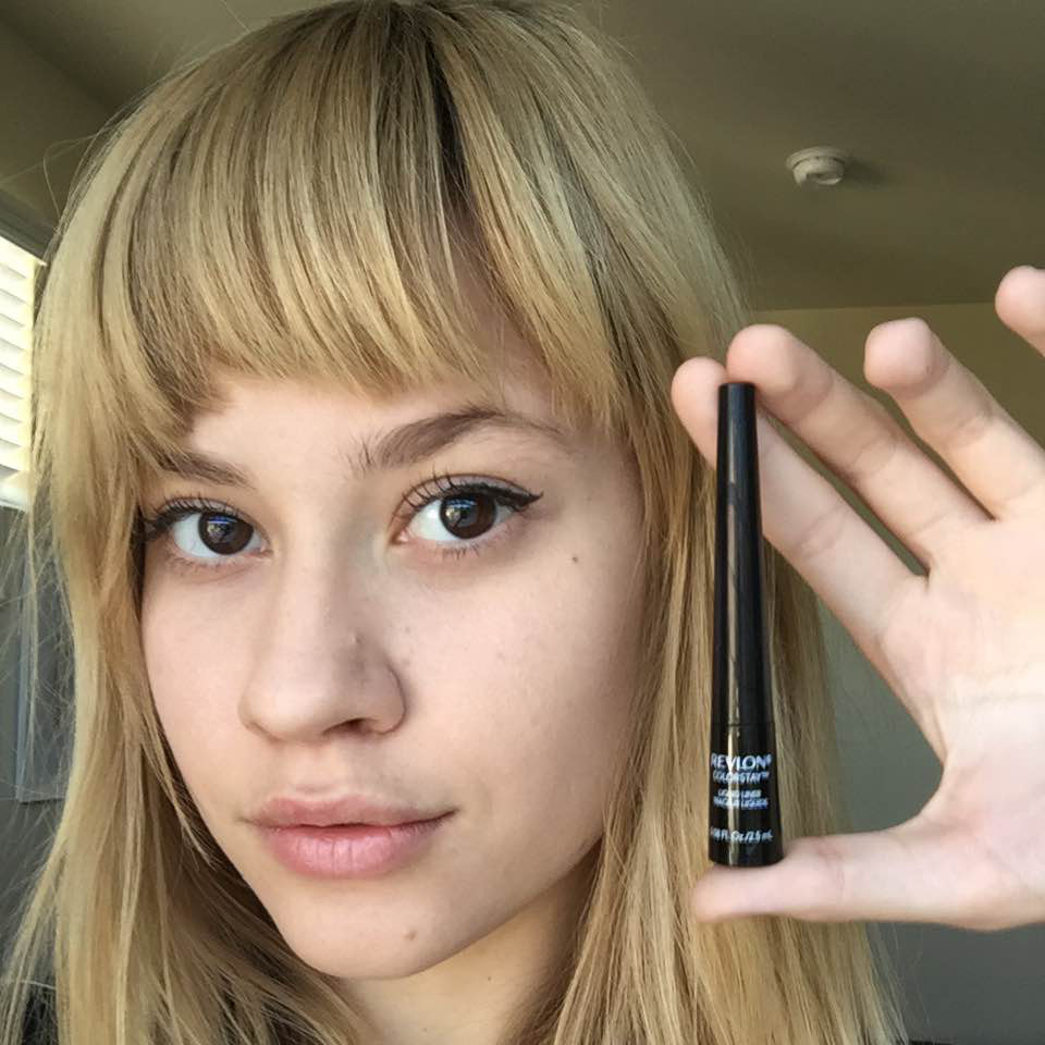 I never wear foundation because my skin gets greasy so fast if I put on makeup, but with the Glossier Perfecting Skin Tint it’s like putting water on your face. It feels like I’m not wearing anything, honestly. I never do blush, but if my sister does it on me—she does my makeup on me every now and then—she uses like a little bit of Revlon Lipstick and then dabs it. I love a cat eye! I have these almond-y shaped eyes and I feel like it enhances it sometimes...it’s a way of looking really dressed up without even trying. I usually just do a half-lid and a little wing with Revlon ColorStay Skinny Liquid Liner.