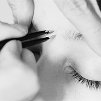 Lightly. Think between 5-10 hairs max. You're not creating an arch that wasn't there to begin with—instead, you're just helping to define the pre-existing brow architecture. While you're at it, survey the landscape for any stragglers growing too far below the rest of the hairs. That last part will depend on how much space you have between your brows and your eyelids. While plucking, hold skin in place and pull hair in the direction it naturally grows. You'll start feeling the benefits of that oil right about now.