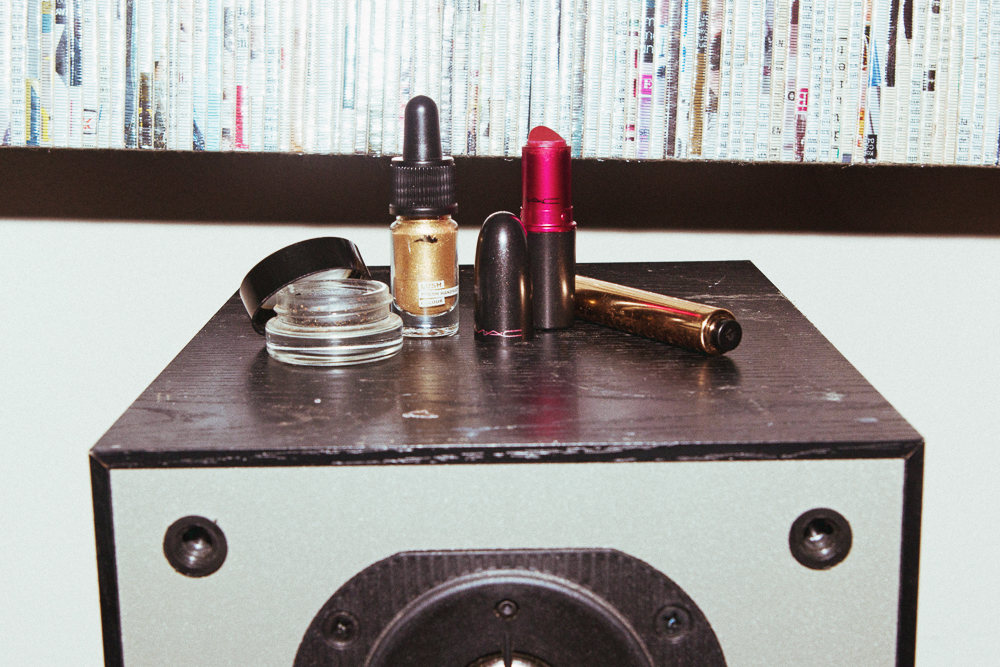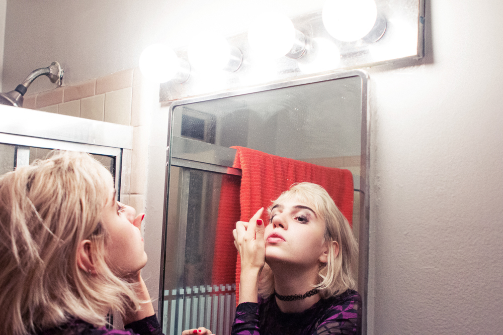 I also don’t ever wash my face. I never touch it. I have this Klorane Floral Water Makeup Remover thing I got at Ricky’s, so I’ll use that. And then I have a Vitamin E Illuminating Moisture Cream from the Body Shop I got with my mom at the same time that we got the gold stuff. I do that when I remember. Like once a week. But usually after a show, I have my Red Bull anxiety attack, I lie down, and I fall asleep. I can fall asleep anywhere. I’m really good at sleeping! I have a really bad habit of sleeping in my makeup. On tour, it’s good because then I don’t have to do it again the next day. You can kind of let it set in for a few days and it gets really gnarly.”