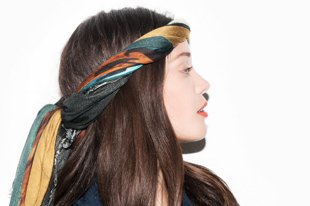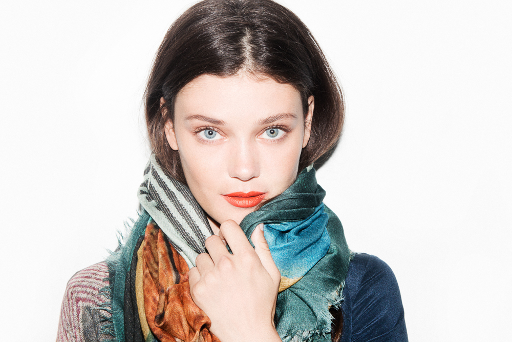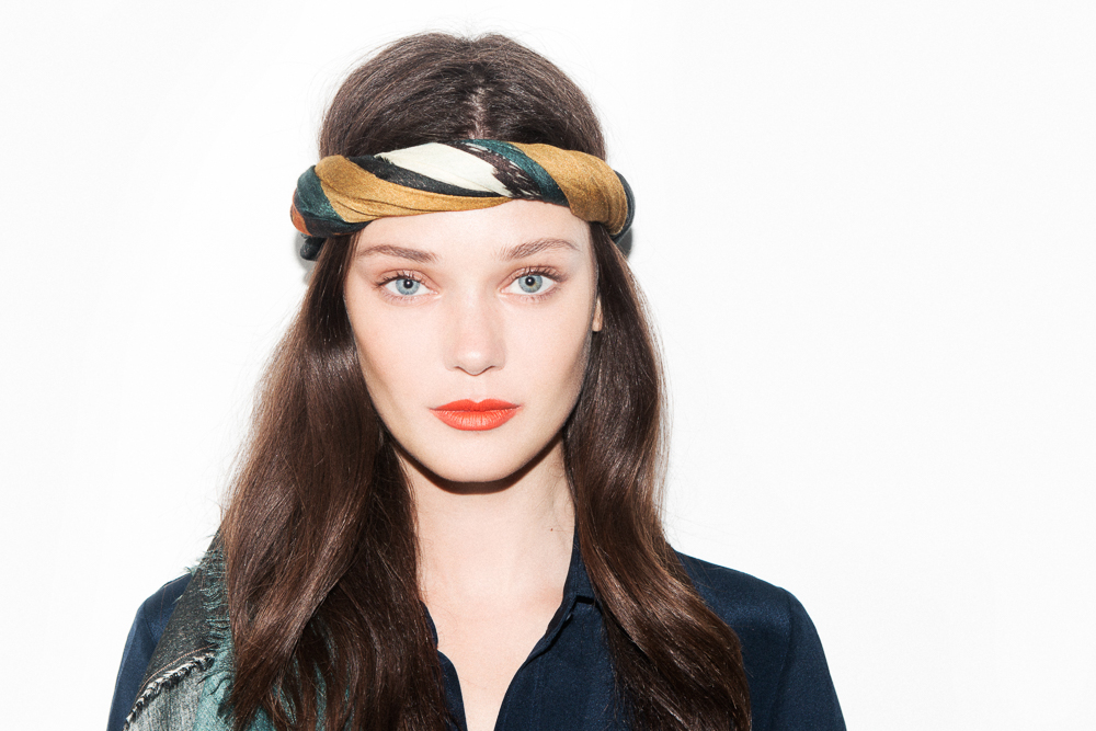 For the moment though (and lucky for us), she's a free agent. Taking full advantage of it, here she is in a matte orange lip pencil from Sisley and a beautiful Maiyet scarf she just picked up down the street from our office (and was so excited about it, she had to put it on right then and there).