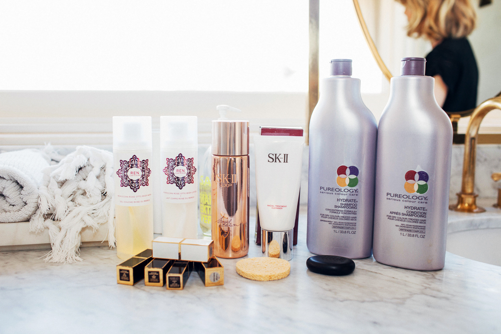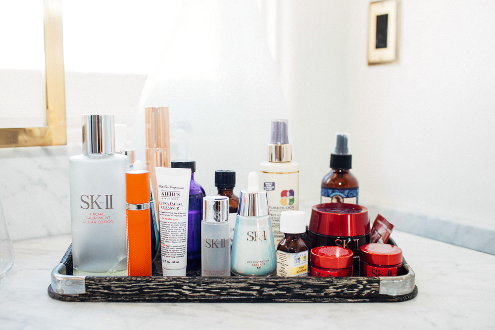 I steam in the morning, so I’ll put SK-II LXP Ultimate Revival Essence on and I let that stuff sit on my face while I’m in the steam. Then when I come out, I kind of rinse it off with the regular SK-II Facial Treatment Cleanser with a sea sponge. After that, I put the SK-II Cellumination AuraBright Illuminating Essence on, followed by the SK-II Essential Power Moisturizing Cream. And at night, I use this SK-II Facial Treatment Cleansing Oil to take my makeup off in the trailer at work with cleansing pads before I come home.