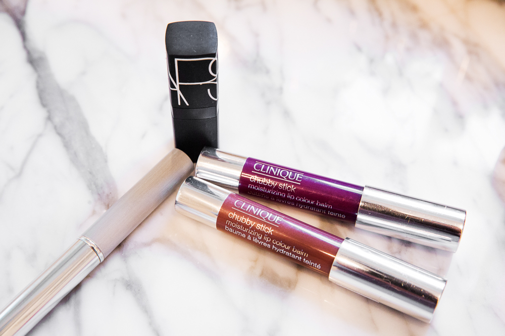 And then I have a bunch of different lip colors. I usually have one Clinique Chubby Stick in a natural color— Graped-Up—and a red lipstick in my purse. I like Short Circuit by Nars, which is not in action anymore. It was a special edition, so I kind of bought up all I could find and then I’ll use Heat Wave, too. For night, I would usually just put on a red lip. Maybe I would add a little bit more highlighter with the Charlotte Tilbury or the Tom Ford. But it’s pretty much just a red lip, and I’ll just mess my hair up a little bit more. I dress so conservatively that I try to have messier hair. And then sometimes I’ll slick my hair back into a little nub.