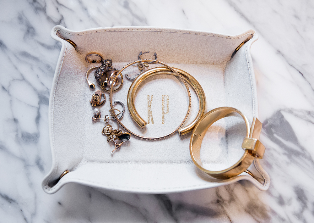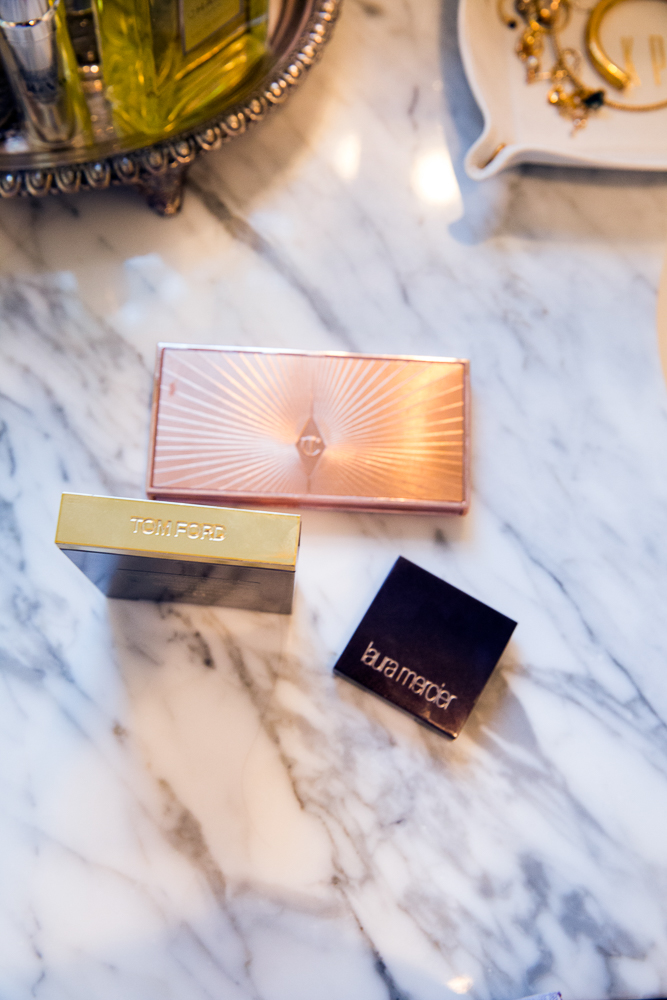 I usually either use Laura Mercier Tinted Moisturizer or Armani Luminous Silk Foundation, depending on the day. Normally I probably would just use the Laura Mercier, or if I have an event or something I’ll use the Armani for more coverage. And then Clé de Peau in Beige is the go-to concealer. Too Faced Primed & Poreless is a powder that one of my facialists recommended because it’s totally non-irritating and you can use it as a primer or as a setting powder. And then in my purse, I carry the Laura Mercier Setting Powder. For blush, I’ve been using this Laura Mercier Second Skin Cheek Colour in Plum Radiance with the little brush. And then I use a little bit of the Charlotte Tilbury Filmstar Bronze & Glow Highlighter and Bronzer—sometimes I use the bronzer, but mostly just the highlighter. Or I use Tom Ford Shade and Illuminate Intensity One highlighter with my finger. And that’s it for my skin.