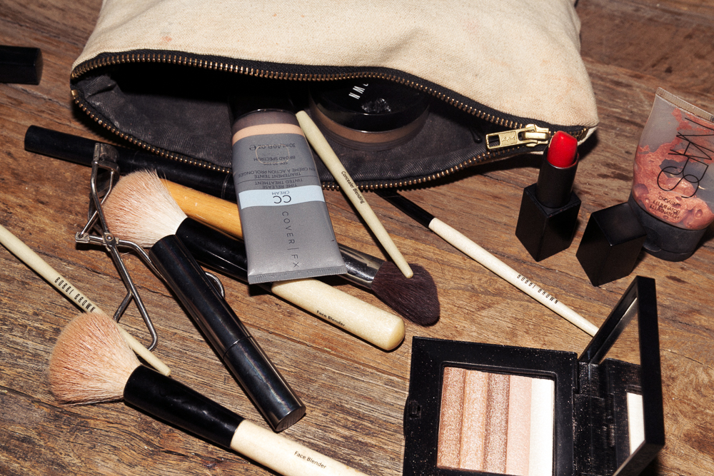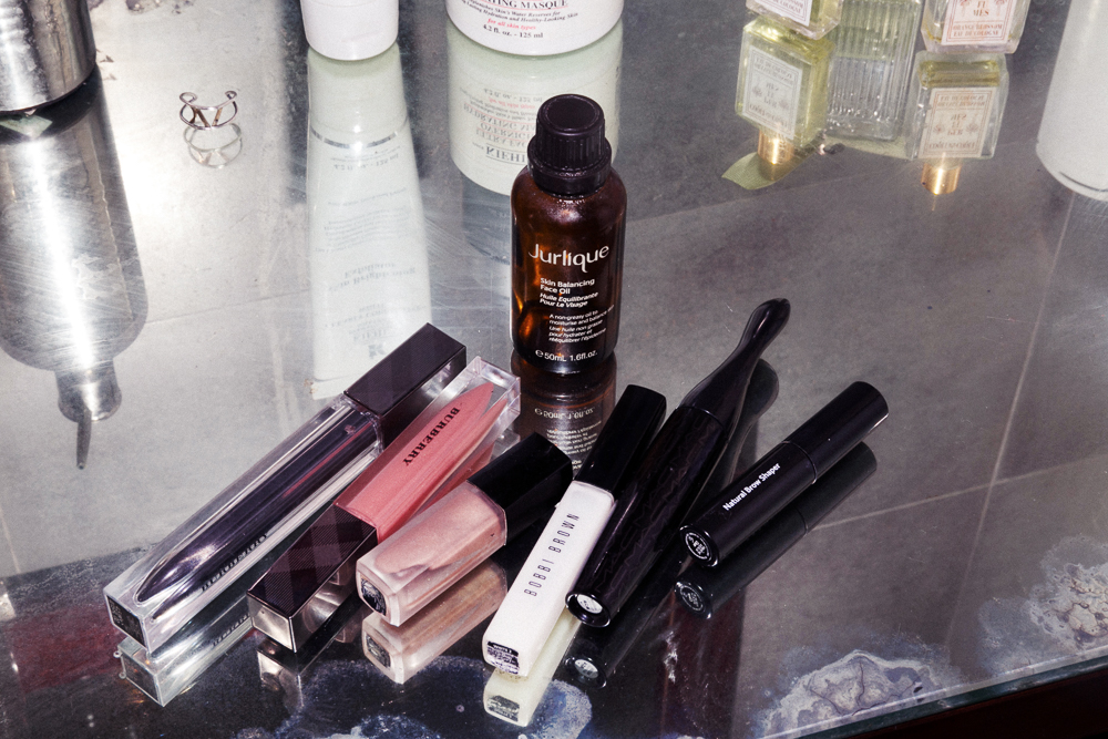 For lips during the day I love Burberry Lip Gloss in Pale Nude No. 9. And Burberry Mascara is really good for daytime because it's light and doesn’t clump up—just lengthens subtly. When you want metallic-y eyes for the evening, this is what you want—Chanel Eye Gloss (ed note: unavailable, but try this). I got it when I was 13 and it's super old. But if you want shimmery eyes that are extra opaque, put water on your brush first, and it’s like watercolor, and it just makes the pigment pop.