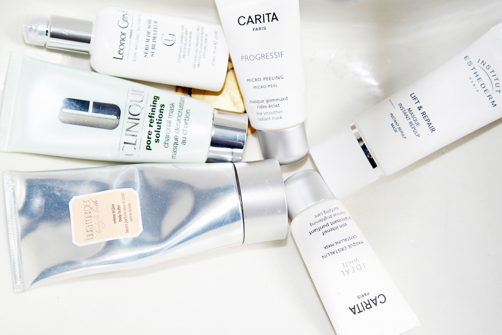 Once or twice a week, I like to do a peel with Carita Paris Progressif Micro Peel. Because I’ve got mixed skin, then I put this Clinique Pore-Refining Charcoal Mask [on the t-zone]. Voila! And then I put a mask on over—usually the Sisley Black Rose Cream Mask.