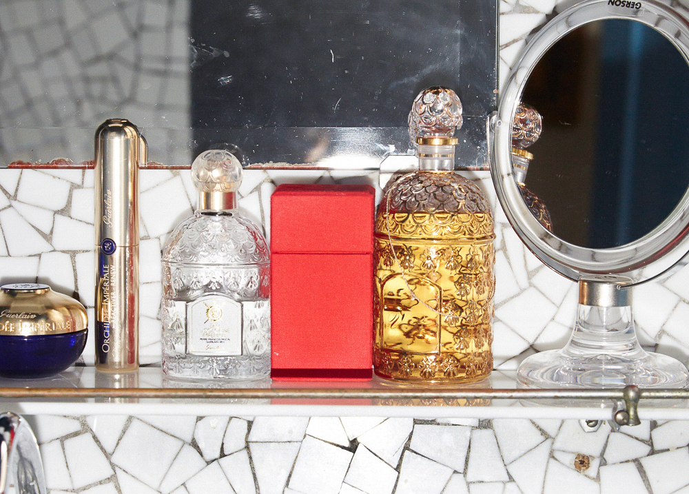 I’m 46 and, for the moment, I don't want to do any injections or anything. I’m trying to resist. But I've amassed a lot of money in creams—prevention! So, I have the Guerlain Orchidée Impériale Gel Cream, and I’m using it as a day cream and in the evening, too. There are other products in the line that are supposed to renew and regenerate…so check in with me in a month and see what I look like. The price is kind of killer though, so I have the Boots No. 7 Moisturizer that I’ve been using for a while. I like that one better in the summer—when it starts to be winter, I like something a bit more lavish. If I have any redness, I use Guerlain Crème Camphréa when I wake up. Oh, magic Guerlain…I use their fragrance, too. Guerlain Eau de Cologne Imperiale is so fresh. At night, I can wear Shalimar.