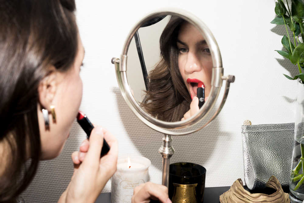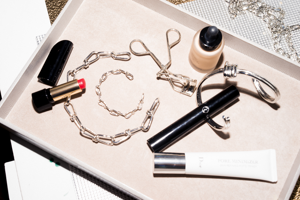 My evening makeup is basically just my day look but more sophisticated. I'll use foundation, but a very light one like Giorgio Armani Maestro. It’s very sophisticated and is totally seamless when it’s on. Then a little bit of Nars Light Reflecting Loose Setting Powder, a touch of Dior Skinflash Radiance Booster Pen under my eyes, and some Laura Mercier Blush. I’ll also use a bit of Dior Pore Minimizer before putting on my foundation to ensure that everything stays put throughout the night. I still want to feel natural, but I’ll build it up by adding a red lip and some smudged kohl close to my lash line. My eyelashes are very light, so if I don’t darken them, my eyes don’t really stand out. My lipstick is always matte because I hate shine—it’s not chic. My favorite one is Giorgio Armani Rouge D’Armani in 400.