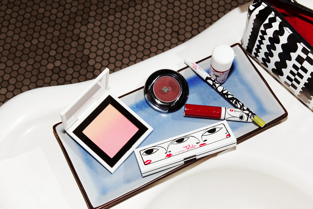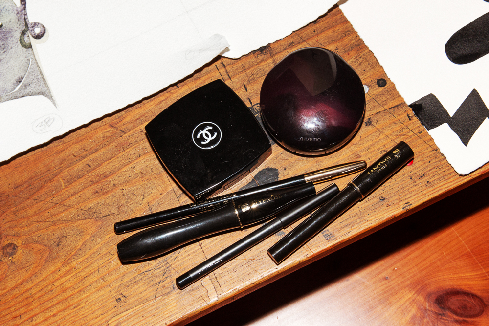 Another thing that goes back to my mother—and my grandmother—is pressed powder. I wear the Shiseido Powdery Foundation all the time, lightly for every day and then heavier if I'm going somewhere. Then I have a lot of eyeliners, I have to admit—my eyes are my biggest canvas. And eyes are easy for me. Lancôme Artliner has a great brush, MAC Smolder Eye Kohl is good when I want to smudge, and Lancôme Hypnose Mascara stays on forever. For blush, I have a lot of redder colors... Lancôme Color Design Blush is on the lighter side. That's why the blushes I did for MAC were gradients, so you could have both ends of the spectrum.