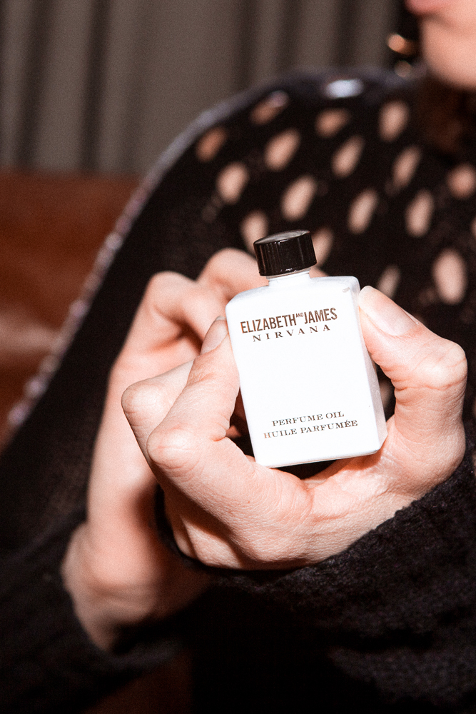 The best for me is when the oils that I use on my skin smell really good, like the Marula Oil. I almost use it as a perfume because it smells so amazing. Elizabeth and James has two scents and I have the both of them—they’re both called Nirvana—but there’s the Nirvana White and the Nirvana Black and I love them both. The black one is more musky and the white is more floral. They come in the solids, which I like. It’s a beautiful case, too.