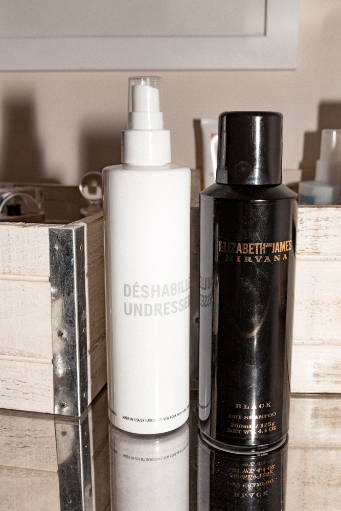 Over the last year I’ve gotten much more comfortable with experimenting with my hair—but I think I want to be blond forever. Naturally, I’m dirty blond, but I’ve lightened my color a lot with highlights. I go to Colleen at Spoke & Weal and it’s honestly really fun to go every six weeks or so and hang out with her and work on my hair. The highlights have been great for my texture—I actually prefer to let my hair air dry now. Every night I wash it, usually with the Five Wits Rejuvenating Cleanser and Balancing Conditioner from Blackstones, and spray in some leave-in conditioner from Verb. Then I sleep on it. In the morning, nine times out of 10, I use dry shampoo to style it. My favorite is Elizabeth and James Nirvana Black, which smells so strongly that it can take the place of perfume. I put it around my part and a little throughout the length of my hair. Then I let it sit before I brush or do anything else, so it actually has a minute to add some body. Then there’s this great new product from Hairstory called Undressed, and I think the only thing to classify it as is a conditioning beach spray. It’s nice because it doesn’t dry you out, but also adds texture—if I could bottle the texture of my hair, it would end up being this product.