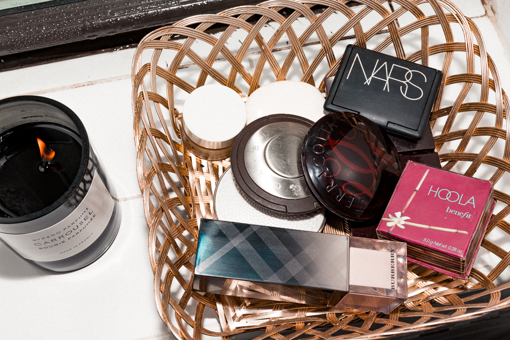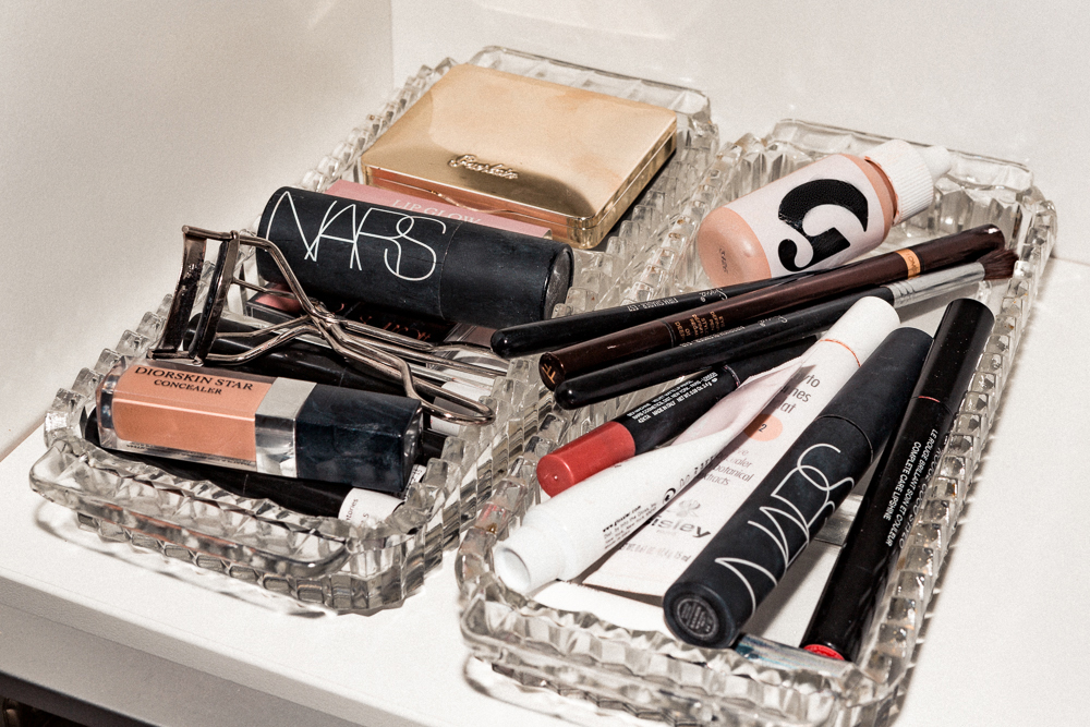 My lip balms are all with my makeup instead of my skincare because that’s usually my first step. Glossier Balm Dotcom is the most moisturizing salve, and I use it on my lips, brows and cuticles. But for lips I also like Dior Lip Glow when I want something that brings out a bit of color. I’m into lipstick too, but sometimes I don’t want to wear lipstick—I just want something that’s sheer. Lip Glow makes you look very rosy and bright, and it’s easy to apply—which is more than I can say for my eyeshadow. I’m no good at that, or eyeliner, or any eye product really. The eyeliner that’s hardest to mess up is the Tom Ford Eye Defining Pen. Sometimes I’ll just use bronzer on my lids because it takes five seconds but looks good. Benefit’s Hoola is the best because it doesn’t have any shimmer in it. Lately I’ve been finding lots of warm-toned eyeshadows that I like—the Four Couleurs Les Cendres Palette from Guerlain has this darkish, warm-but-smoky color that I use a lot. And then the Hammamet duo from Nars is a duo with peach and a bronzey copper color with shine. I like the bronze—it’s a metallic that’s toned down a bit.