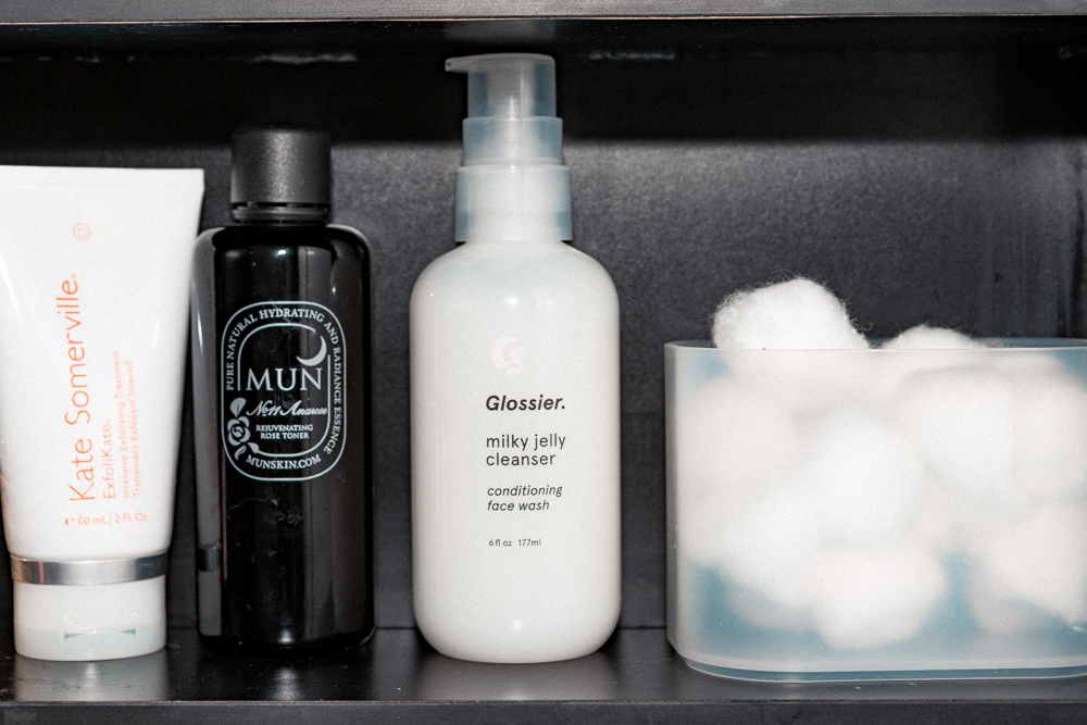 For a while, I was dealing with hormonal, stress-related acne. It was pretty painful, and it took a while to figure out how to get rid of it. I worked with a dermatologist at Tribeca Skin Center, Dr. Kil, throughout. I tried Spironolactone briefly, but it didn’t help—it made me kind of shaky. I got a couple of cortisone shots... Then finally we figured out the right products for me. There’s a face wash called Sumadan that I use once a day in the shower and it knocks acne out. It has sulfur in it, and if I were comparing it to another product it would be that industrial strength hand soap that you see at construction sites sometimes…that orange, gritty hand soap. It’s not a pleasant product to use but it makes a difference in my skin. In the morning if I’m not using that, I’ll use Milky Jelly, which is the total opposite in that it smells like roses and is a complete pleasure to use.