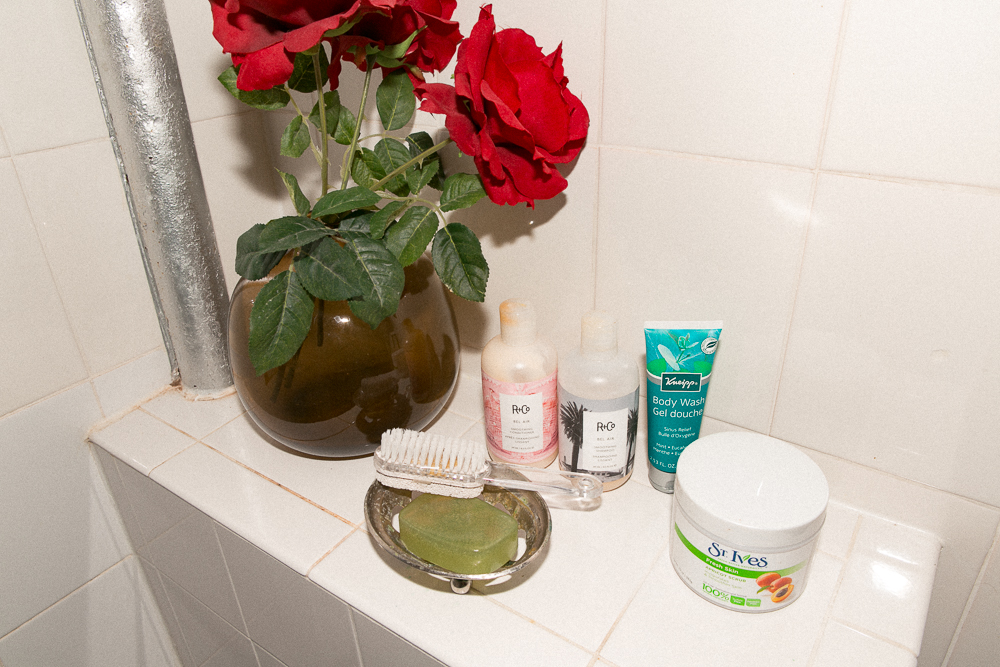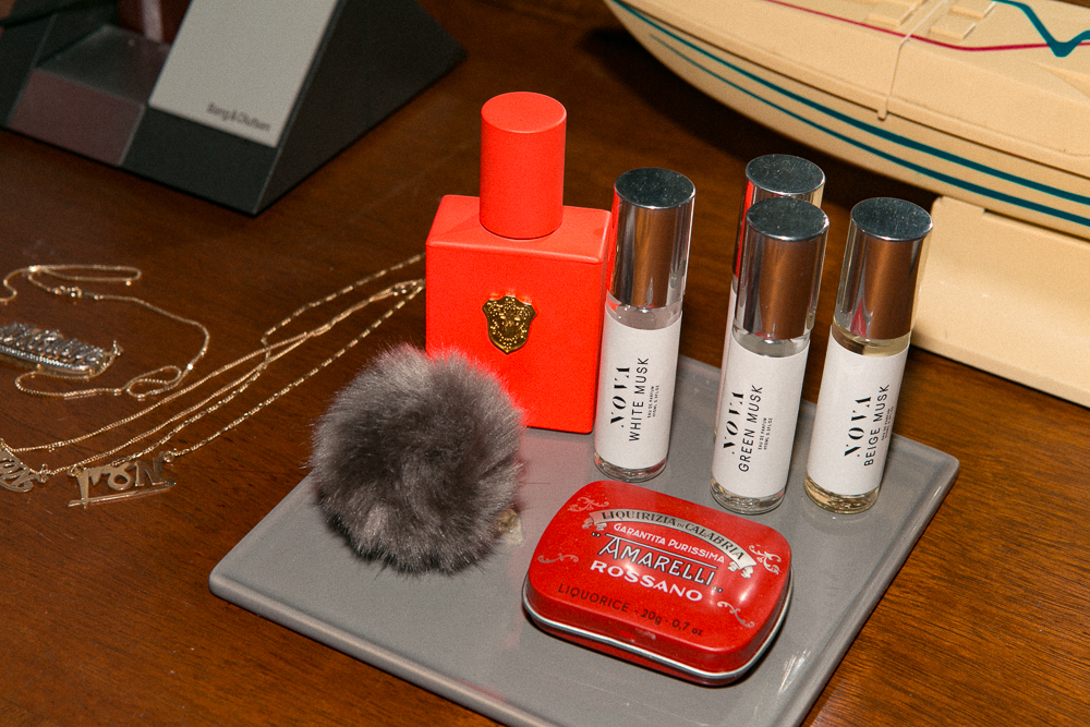 The biggest hardship of my beauty routine has been to tame my hair, because it’s really thick and coarse and curly. You wouldn’t know, but it is. Because I work so much, I end up not having a lot of time to make the curl look the way I want, so I'll wear it straight most of the time. I wash it, I let it air dry, and then I iron it. I like using Chi Oil and camellia oil... All of my different body and face oils are for my hair, too. Every now and then if I want it to stay put, I’ll use this R+Co Park Ave Blow Out Balm. It smells yummy.