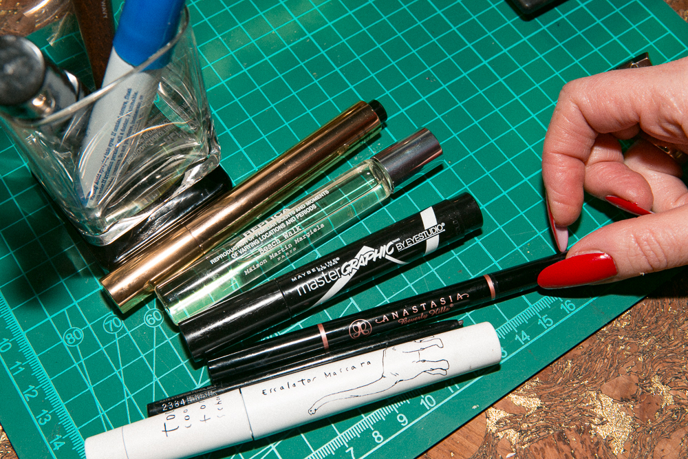 Then I work on my eyebrows. I use the best, which is Anastasia's Brow Gel, and then I'll set it with Maybelline Brow Drama. I like it because [the applicator is] a little ball. Maybelline Eye Studio Master Graphic is my favorite eyeliner. What’s great about it is that it looks like a Sharpie, and I love anything that looks like art supplies. I like to be making my art and painting and drawing, and then I go to the bathroom and I paint on my face with the same kind of tools, you know? I want everything to feel like that. And after I put that on, I'll use this Too Cool For School Dinoplatz Escalator Mascara. It makes me feel like I'm turning into a doll. I love anime, so anything that's going to make me look like a Japanese doll is key.