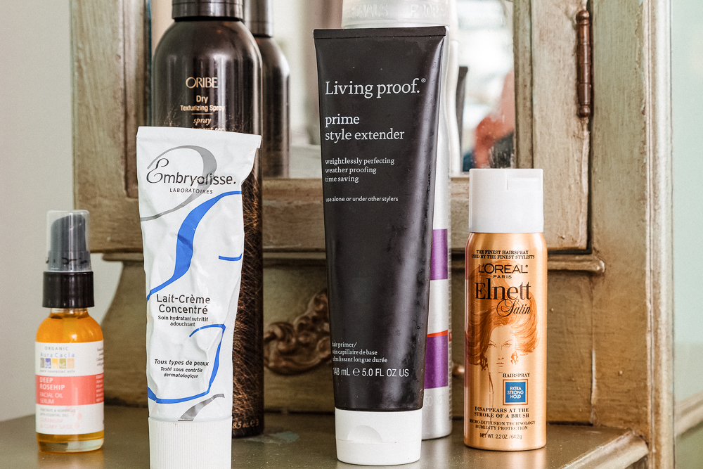 When I wash my hair, I'll use a Kérastase Shampoo and Conditioner. Right now I’ve got Living Proof Prime Style Extender and I put that through to protect it from the heat, and I use a little bit of thickening hairspray on the roots before I blowdry it. I try to not wash my hair daily. I kind of like messy hair—Day three is the best day, but it’s also the last day. After a blowdry, the Oribe Dry Texturizing Spray is amazing and it smells really great, too—it’s like wearing perfume. And then there's good ol' Elnett, which has been around forever. My hair is naturally blond and thin, so I like to give it some texture. Sexy, dirty bedhead is good for blonds.