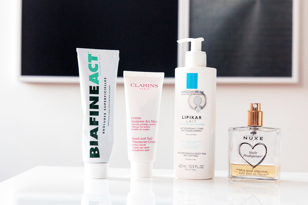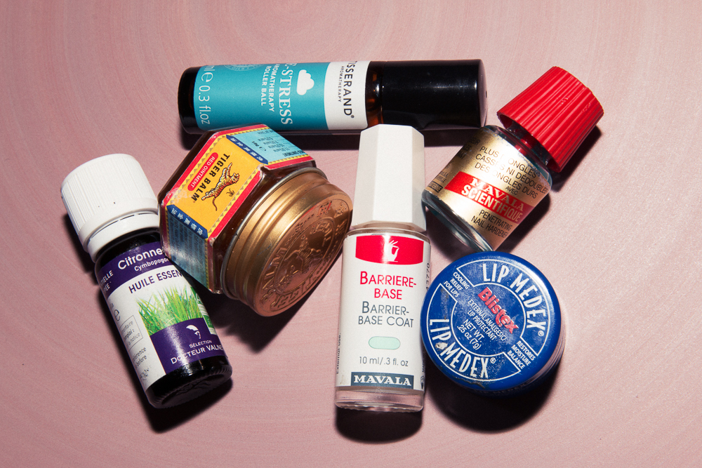 I usually wake up and have a shower. Then I put the Nuxe Huile Prodigieuse on my body. It’s not super strong, the scent is so soft. It penetrates, but it also gives you a shine and it’s light. Sometimes if I am super dry, I have Biafine for my legs. It is supposed to be used for burns. I take it with me on set because if we are shooting in a weird location, people don’t protect themselves with sunscreen so I give them a little bit of this. If you have the great chance to have an aloe plant around you, you can just cut a piece and put it wherever and it’s the greatest thing ever. The bottom part of my legs gets so dry from wearing jeans and boots, so you put one coat of [Biafine] and the next day it is perfect. It’s not an everyday cream. And because I go to Mexico a lot, I’ve discovered Tiger Balm for mosquito bites. You rub a little on and don’t scratch it.