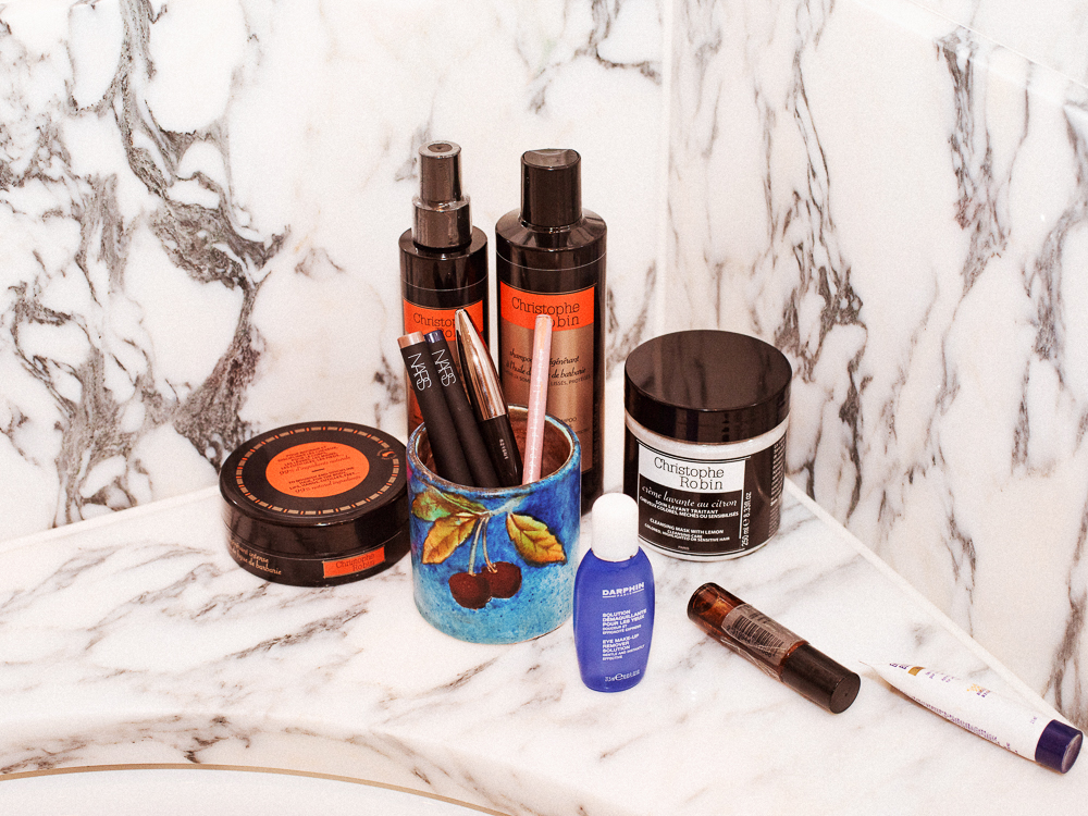 Not being a natural blonde, I've always taken care of my hair. I've used Christophe Robin's products for 15 years because they're very, very good—he develops them himself with natural ingredients that are very gentle. He has a Cleansing Purifying Scrub with Sea Salt that I use once every three weeks to clean the scalp. When I'm working, I only wash my hair twice a week because it's very thick and it will get too fluffy. But when I do wash it, I use the Christophe Robin Cleansing Mask with Lemon as a shampoo—it's really incredible for blond hair because it gives it so much shine. And then there's this product he makes that I can't live without called the Intense Regenerating Balm. It's actually very light, not greasy at all. You can put it on all the little hairs in the font of your face to smooth them. That's always in my bag."