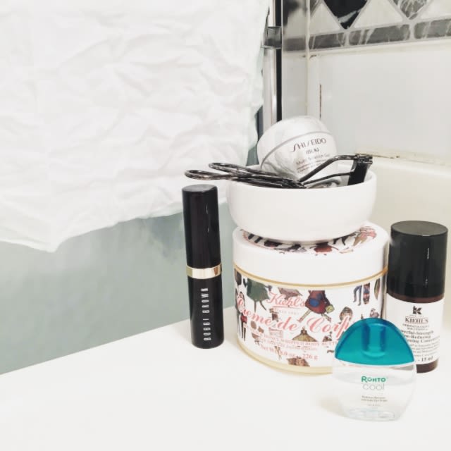 Skincare is also important. My routine has gotten much gentler recently, and now includes my décolletage—which is a major sign that my shit's together, right? In the morning, I’ll use a little Caudalie Gentle Cleansing Milk or Shiseido Ibuki Gentle Cleanser, which smells heavenly. I buff away my cleanser with a Liz Earle Muslin Cloth. Then I soak cotton pads in Liz Earle's Eyebright Soothing Eye Lotion, which I refrigerate, and put that all over my eye. I like to use a serum on my face and neck, and right now I'm using two...Caudalie Vinoperfect Radiance Serum for dark marks from blemishes and Shiseido Ibuki Softening Concentrate for general glowiness. Then I put on Shiseido Ibuki Refining Moisturizer, which I was just introduced to, and it's changed my life. It makes my skin so soft, and the formula helps gently exfoliate.