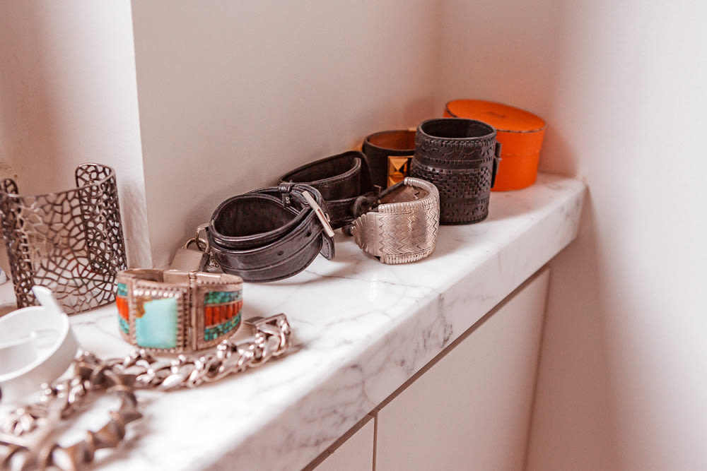 I don’t have that much, it’s such a small, simple recipe. Maybe you need a concealer, but you should do it with your finger and tap it lightly, don’t cover up your whole face. These days I use RMS Un Cover-Up because their textures are amazing. The concealer gives you a glow and a shine, but it’s a natural shine. Just use it on your finger around your nose and under your eyes and when you have a spot. And then powder. I use Shu Uemura—it’s a light matte powder with a brush you use all over, but it also doesn’t dry out my face. And then I use a MAC Blush called Love Rock that was made for Zadig & Voltaire. My favorite things for lips is Chili from MAC because it looks red but it’s transparent, like someone bit me—only no one bit me! Maybelline Great Lash Mascara I’ve used since I was a model, too. For eyebrows, always brush them upwards—I think that’s something my mother taught me—I use a toothbrush just for that. I draw them in with Rubis Swiss-made pencil, which I always have with me. It’s a very reassuring feeling knowing I have that with me. For events I do have a brown glittery Shu Uemura Eyeshadow that I use with a thin brush around the eyes like an eyeliner, or I do a smoky eye on the eyelid and a bit more mascara.
