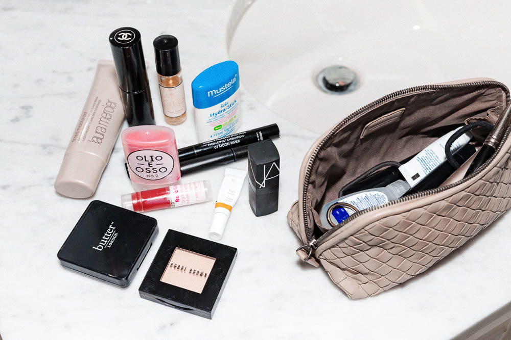 My mascara has to be really light. I use Clinique Naturally Glossy, and I've had it since I was 10 because my grandma used to love Clinique. Troy Surratt has a good one too, and it has that same lightweight, like nothing feeling. I don't like waterproof mascaras—the Clinique probably only stays on for one hour but it’s fine for that hour. I will not do makeup remover at night. I just want to cleanse my face and be done with it. I do the Laura Mercier Secret Brightening Powder if I'm feeling tired. I discovered that after I had my first child and my mom was like, 'You look really good with that, you need to wear that more.' But I don't like a smoky eye. It just looks so heavy! And I'd always rather just do a lip. I like Nars Manhunt, which is a sheer orange, or Suratt Beauty Lipslique Nu De Soleil. Sometimes I'll do a liquid liner, if I'm feeling saucy.