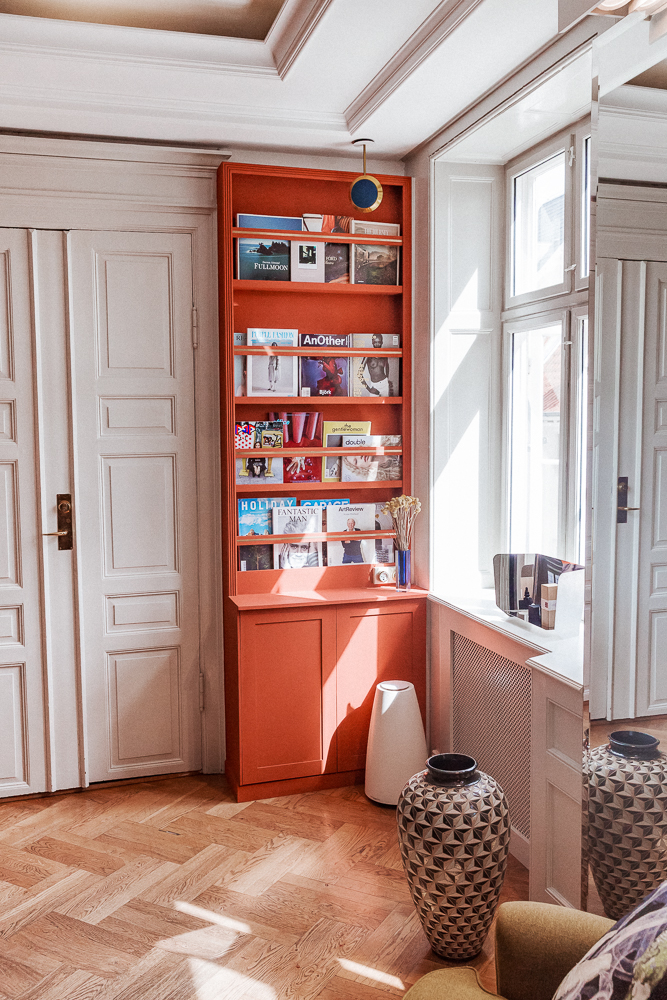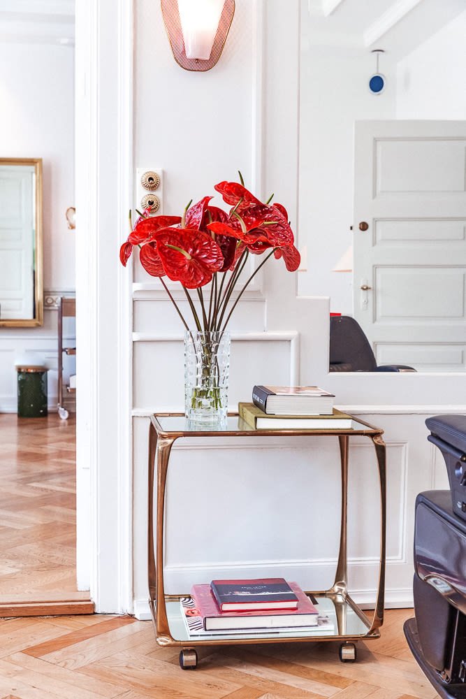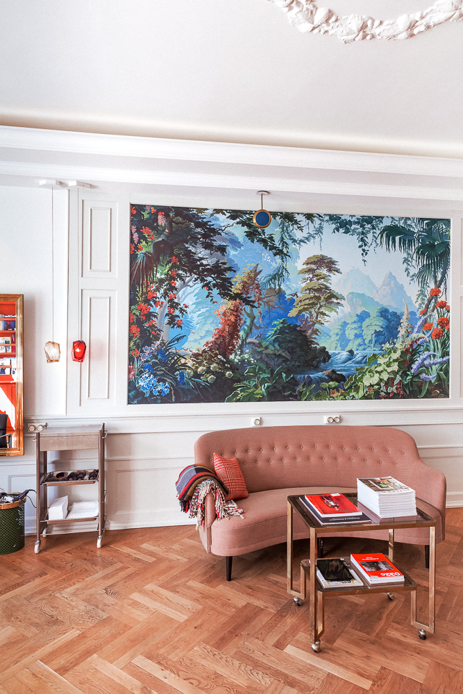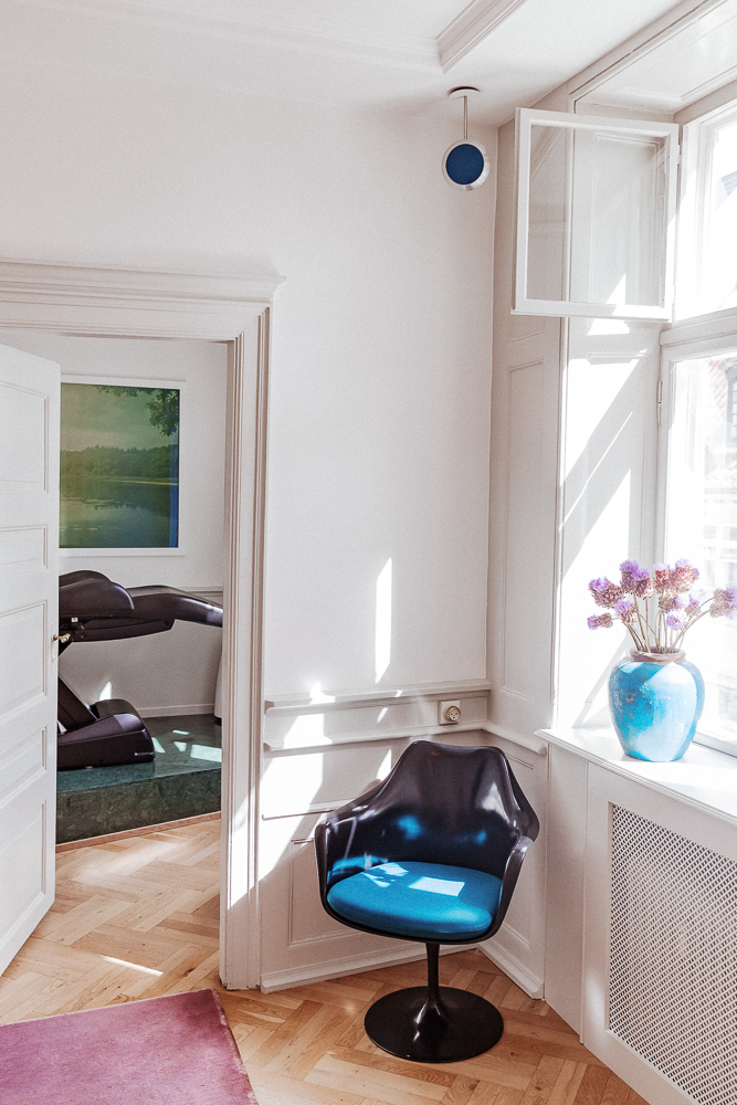 The studio's design elements are minimal but personable, which seems to be the flavor of Copenhagen. It’s a mix of things; wallpaper that looks as if it should be in a museum (because it is: Cim had to get permission from the source museum to use it); a blown-up still from Lars Von Trier’s Nymphomaniac; Takara Japanese salon chairs; bursts of green marble. Cim is a big fan of Svenskt Tenn, too.
