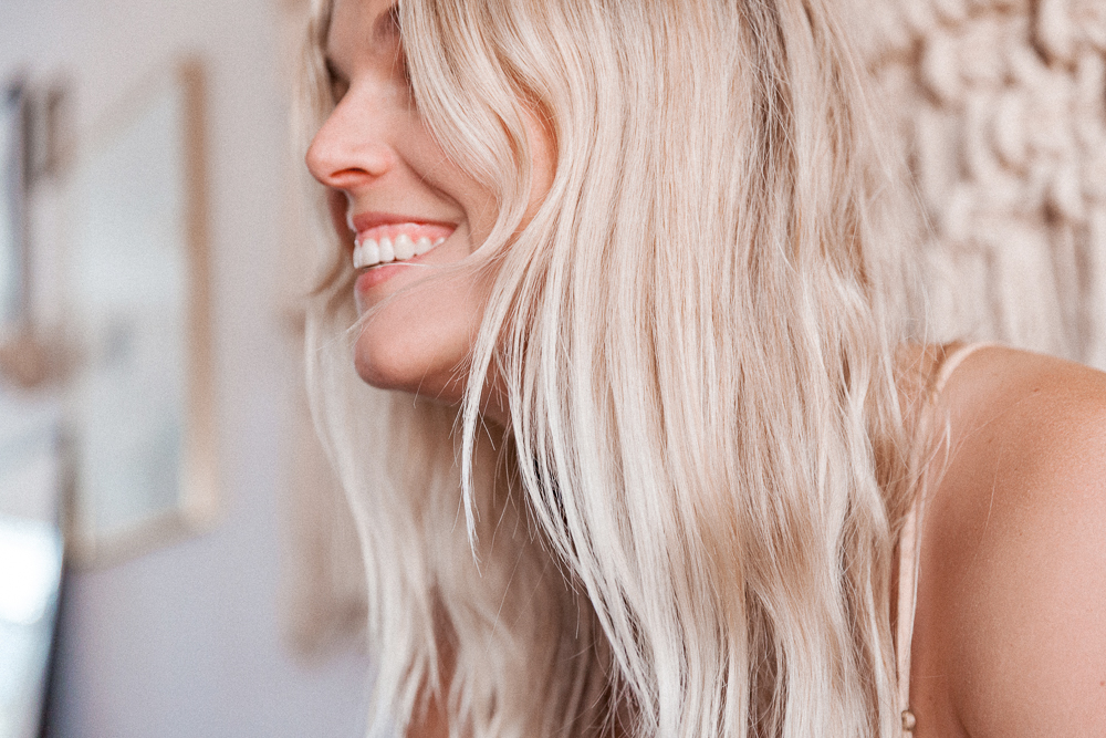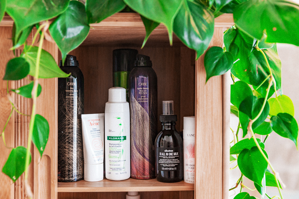 My hair was bleached three years ago so the ends are still suffering from that moment. This Davines Oi Conditioner has been saving my life. Also the Oi All in One Milk is incredible for post-shower. I’ll put that all over. It just adds softness and amazingness. I only wash my hair once or twice a week, but I really hate having clean hair, so I like the Oribe Dry Texturizing Spray. And it smells like heaven. I don’t always wear perfume but when I spray my hair with that, people will ask me what perfume I’m wearing.