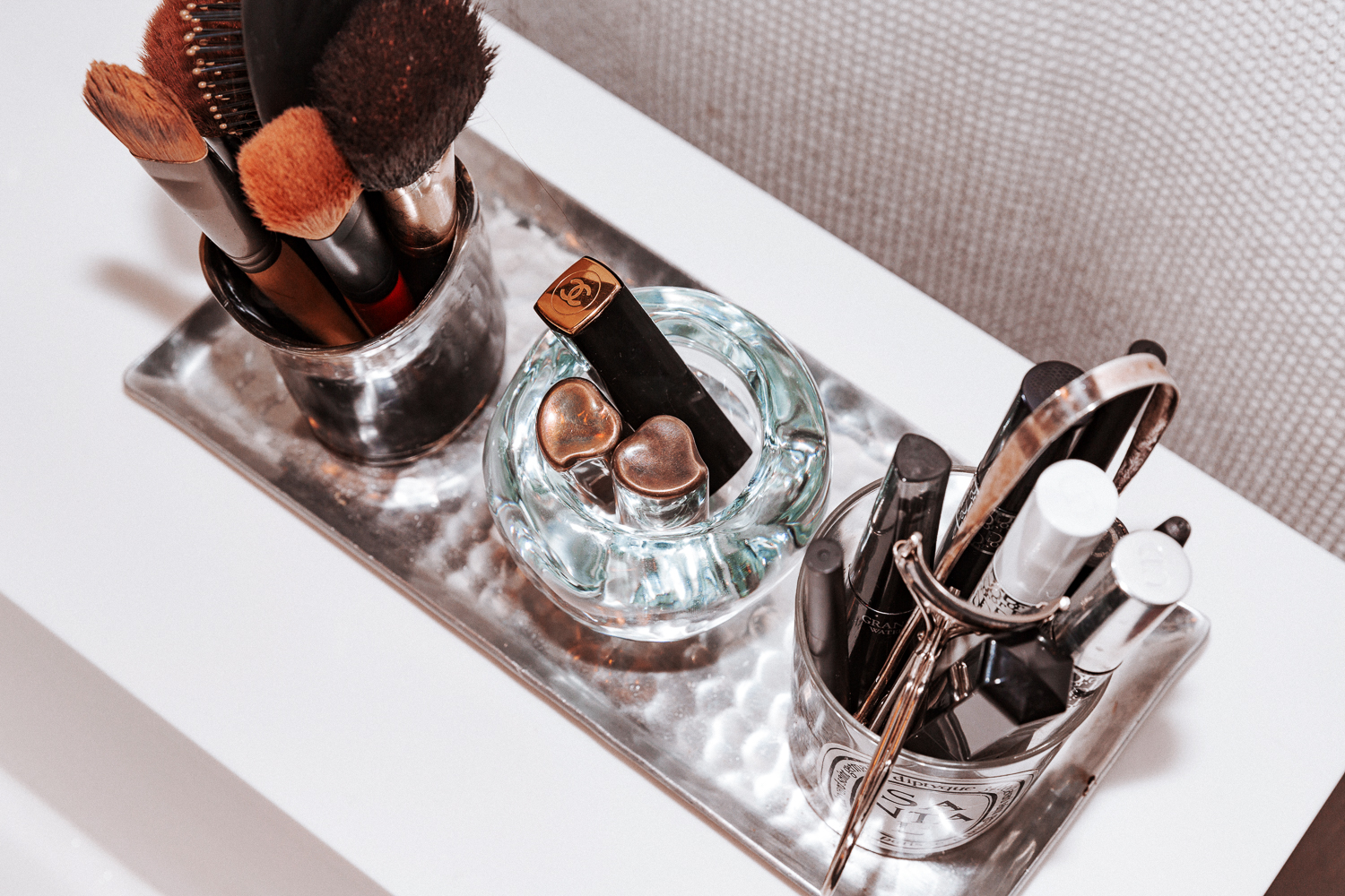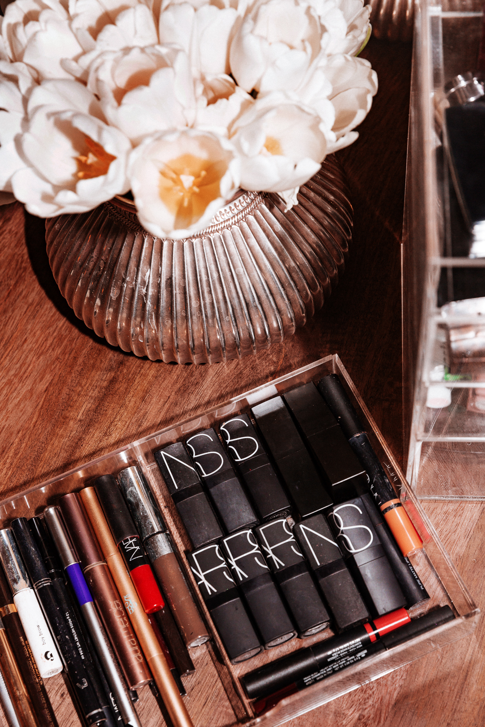 I'm not into contouring, but I do like blush—Chanel Rose Bronze is gorgeous and works really well. If I’m going out at night, I’ll put on a lip. And I do a lot of different ones. I’ll go through phases where I’ll be obsessed with one lipstick and then buy five of them. For the last few years it’s been Nars Afghan Red. Sometimes I'll switch it up with Heat Wave. I prefer a matte lip. The Dior Lip Glow has become a staple of mine as well. Day to day, I've been wearing the Glossier Cherry Balm Dotcom. I like it because it's natural but has the tiniest bit of color. And I love the smell... It reminds me of childhood, and drinking Icees."