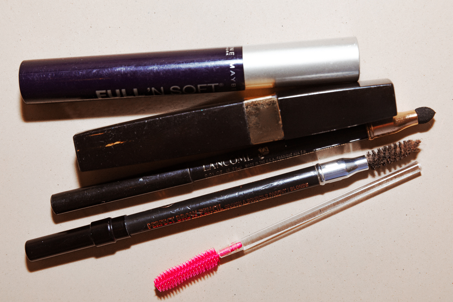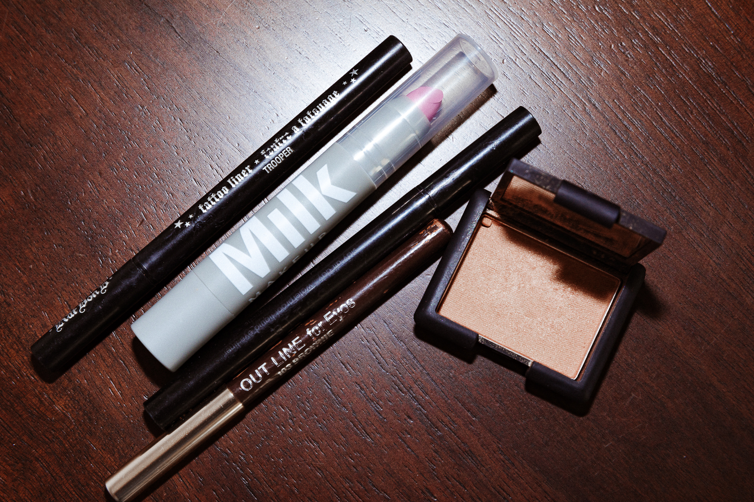 Chanel Inimitable Mascara is amazing, but mine is really beaten up. So is my liquid eyeliner that I got at Ricky's—I think it's from Mary Quant, but it's impossible to see the label. I also have the Stila Stay All Day one, and the Kat Von D Tattoo, all in brown. I used to wear a lot more black, but I think there's something about brown that makes a green eye pop. And it's a bit sexier than having a really dark eye, a little softer. Plus I have two events tonight, so it has to work for both.
