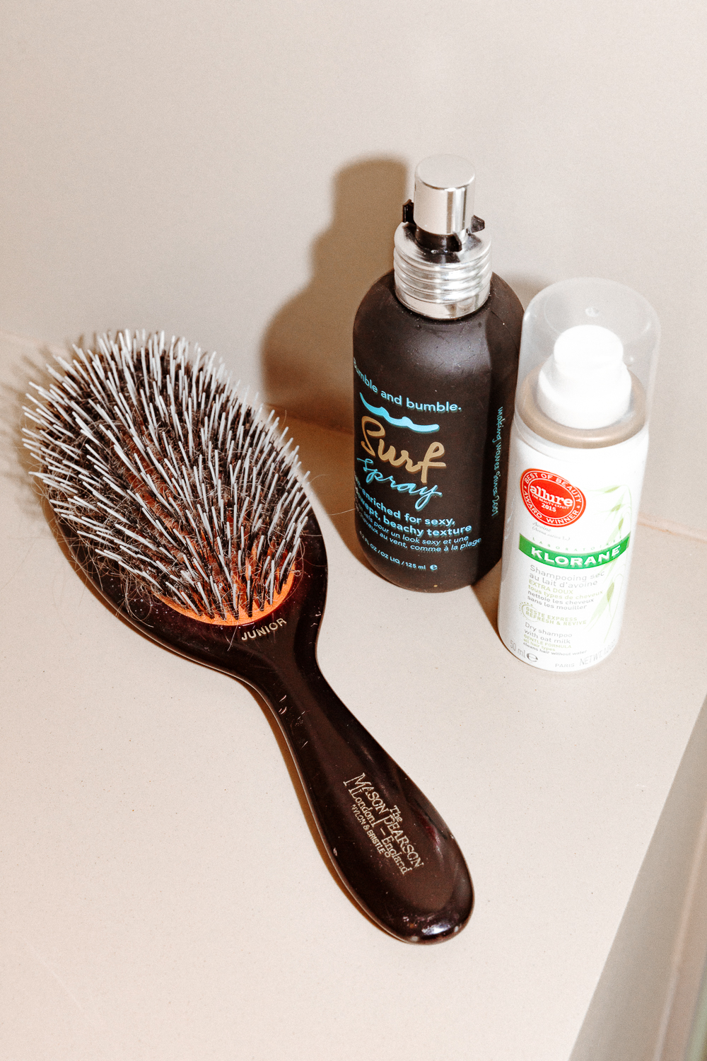In the shower, I use Frederic Fekkai shampoo, the pink one for blond and color-treated hair. I swear, after I use it, people ask me if I’ve gotten my hair done. Tonight, I just used Bumble and bumble Surf Spray. With this length, it’s become so easy to style. As soon as I get out of the shower, I lightly toss it and let it air dry to give it this beachy wave. It’s kind of my easy go-to—I like to keep my hair chill.