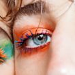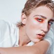 Rays of neon cast against moody color fields. The mascaras here are YSL's Volume Effet Faux Cils along with some unfortunately discontinued orange Chanel mascara. "It's an interesting way to experience color," said Lucy. The cream shadows, which also came from YSL, were applied imperfectly with fingers and then traced and smudged with Vaseline. "I love it to feel melted and organic."