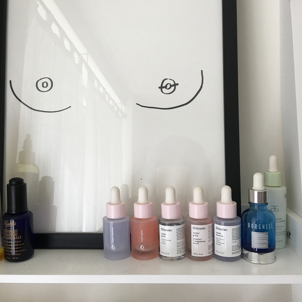 The first thing I do every morning is wash my face with Glossier Milky Jelly Cleanser. This is also the last thing I do every night, no matter how hard I go. It's honestly my best friend—my face wash knows me inside out and it's witnessed my most vulnerable moments. I follow it with Glossier Priming Moisturizer Rich. Then it's serum. I use hyaluronic acid and vitamin C, but I'm not loyal to any particular ones. Currently, I'm using Borghese for hyaluronic and Dr. Dennis Gross Vitamin C, which I got from my mom. At this point, it's just about using things that are convenient. SPF is a must—lately I've been using Glossier Invisible Shield.