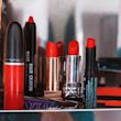 My mascara changes quite a bit. I normally use the Diorshow Mascara and I’ve got this mascara that I borrowed from a friend at a wedding, Urban Decay Perversion Mascara. And I love to use loads of red lipstick. This MAC Fashion Legacy Retro Matte Liquid Lipstick is my favorite actually. I like bright red. First, I use the Dior Addict Lip Sugar Scrub if I have scrubby lips, and then I’ll use their gloss. Sometimes I use lipstick on my eyes–quite often actually–if I’m going out and doing something more. I like warm colors on my eyes.
