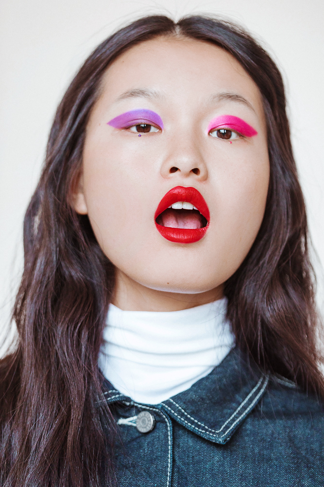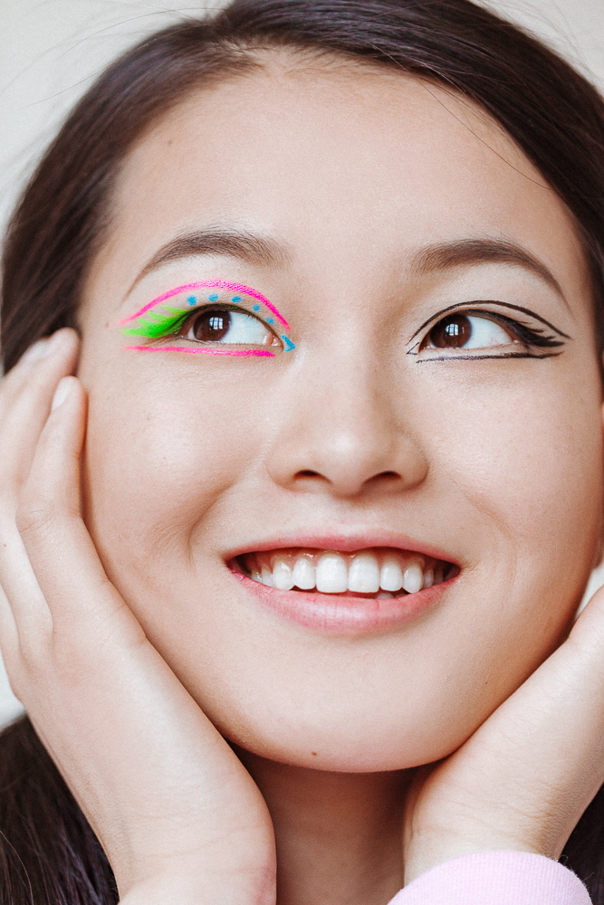 For an expressive look, try winging it—literally and figuratively—with a freeform flick. Emi’s lines were off-the-cuff. “I found that the black was ideal for grounding the look, and the fluorescent color was where the play comes in. It could be two different colors, it could be mix and match, whatever just comes up. Use your normal eyeliner, but use two different colors.”
