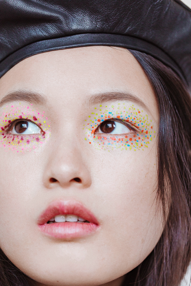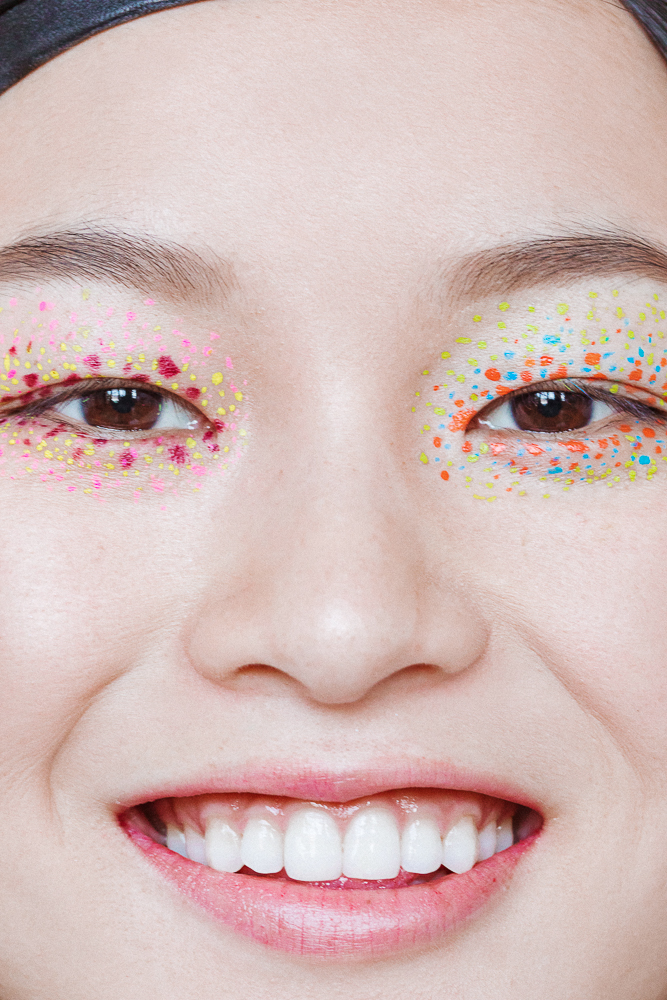 Hello, Yayoi Kusama—is that you? No, it's just Emi, continuing to bring the drama, look after look. The bolder, more pigmented spots were put lower on the lid (eye accentuation is still key!) and lighter tones were applied on the outskirts to widen and brighten. “I was excited by the placement of the colors—the muted tones really help soften the dots’ intensity. It reminds me of a Dutch flower arrangement on the eyes. It’s a more extravagant look.”